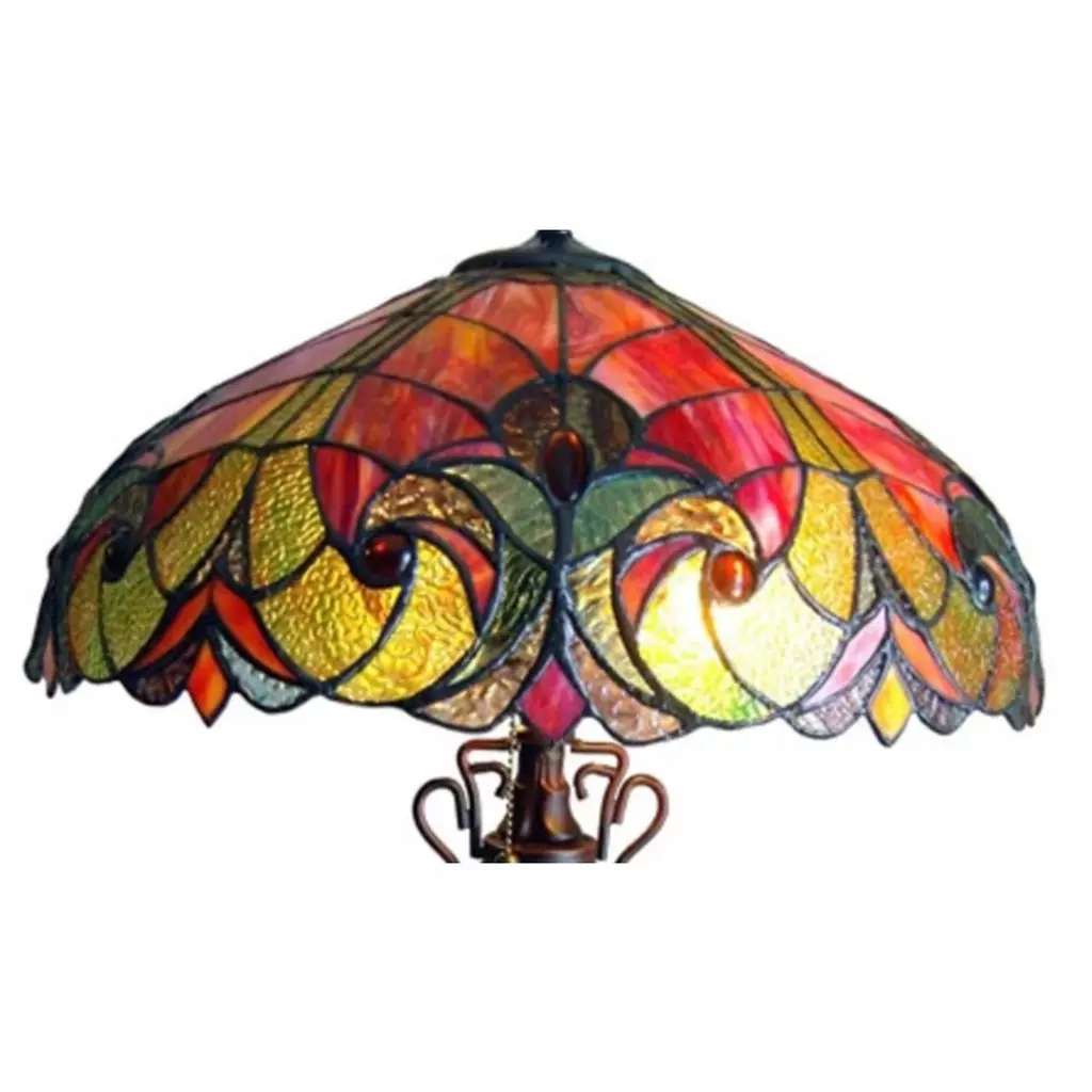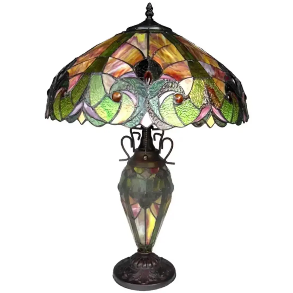 LIAISON, Victorian is handcrafted with pure stained glass, with gem tone, soft pedestals, as well as the Victorian motif. The warm color glow of the stained glass will create warmth to your home. With this table lamp you can make a soft romantic glow by using just the mid-section. The Chloe Lighting Liaison Tiffany-Style Table Lamp stands at 24.5 inches tall, featuring an 18-inch diameter handcrafted stained glass shade with 478 intricately cut pieces and 30 decorative beads. The antique bronze finish base complements the vibrant glass, making it a standout addition to traditional and vintage-inspired interiors. Its double-lit design offers both ambient lighting through the shade and accent lighting through the base, providing versatile illumination for any space.