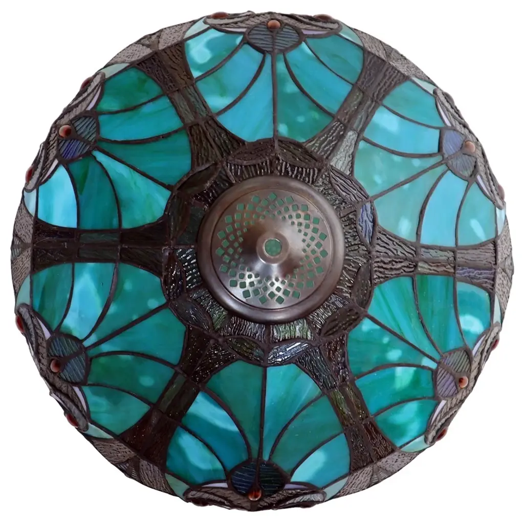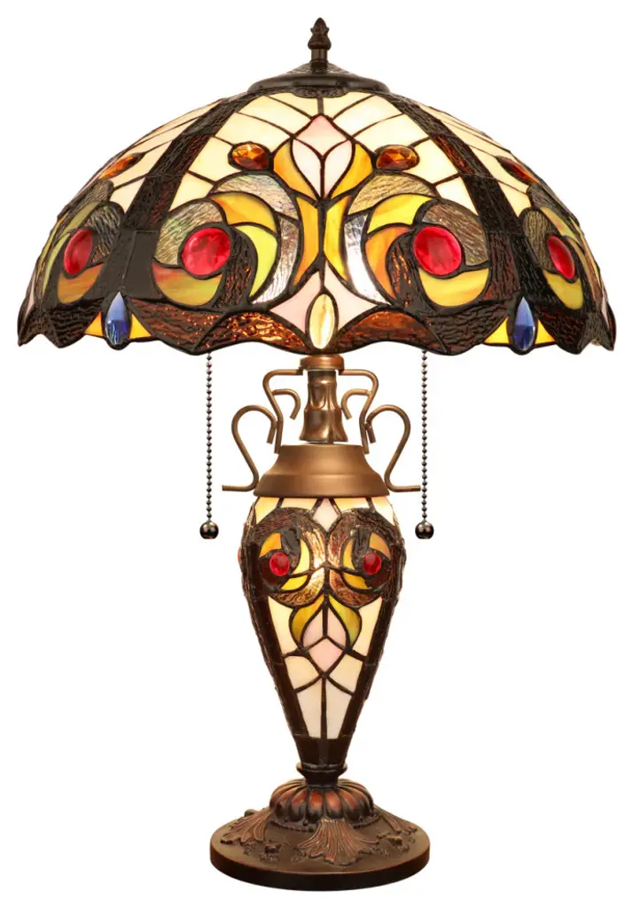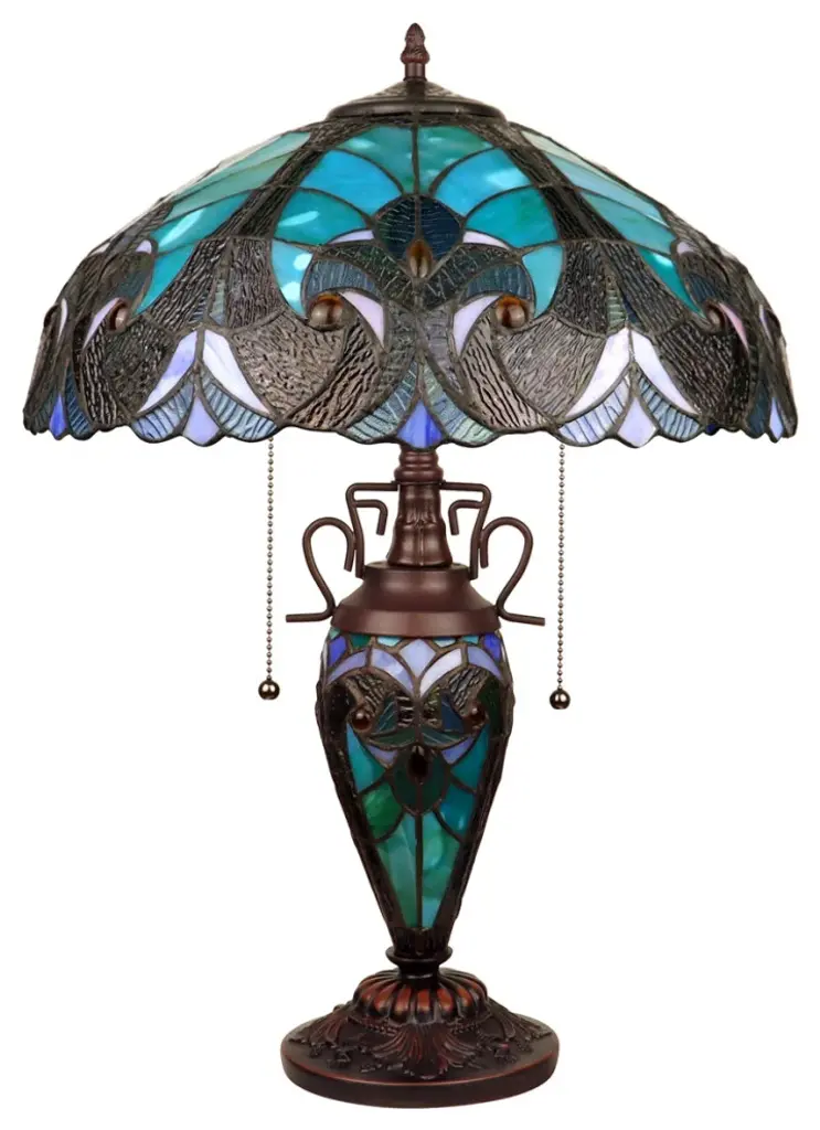 This is a Victorian design 3 light, Tiffany-style double lit table lamp that would be a perfect fit in a bedroom, office and livingroom! The shade is hand-crafted, using the same methods developed by Louis Comfort Tiffany in the early 1900''s. This process entails using 384 hand cut stained art glass pieces and 27 glass beads, each wrapped in fine copper foil and soldered together at extremely high temperatures to form each unique piece. Exact size to the nearest inch may vary, and exact color of each glass piece may vary due to each piece being hand crafted. First image is with the light shining through, second image is with no light. Dry listed and recommended for an indoor setting.