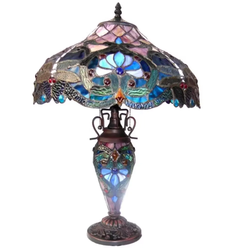 Grace your space with the opulent charm of the Lydia Victorian table lamp, a double-lit masterpiece crafted from hand-cut Tiffany-style stained glass. Featuring soft gem tones, traditional Victorian motifs, and elegant light layering, this 3-light lamp adds a romantic ambiance to any room. Whether fully lit or softly glowing from the base, its antique bronze finish and detailed glasswork offer timeless elegance and vintage warmth. Key Features: Handcrafted with 572 individually cut stained glass pieces and 82 glass beadsDual-lighting design: illuminate fully or softly glow with lighted baseElegant 17" Tiffany-glass shade in Victorian floral gem tonesPull chain + rotary on-cord switch for versatile lighting controlDimensions: 24.25"H x 17"W x 17"D | Shade Height: 8.5" |Weight: 10 lbs This lamp's ambient glow and intricate artistry evoke an heirloom feel—ideal for living rooms, bedrooms, or refined reading corners.