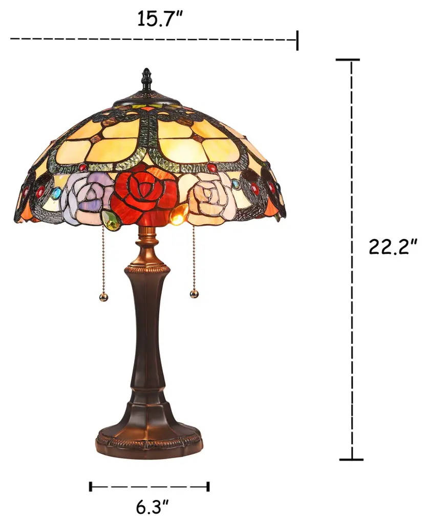 SIMONE, a Floral style 2 light table lamp features 3 gorgeous roses on the front and back of the shade, in purple, peach and red. This piece is handcrafted from over 305 pieces of hand cut, stained art glass and 30 colorful glass beads. Handcrafted using the same techniques that were developed by Louis Comfort Tiffany in the early 1900s, this beautiful Tiffany-style piece contains hand-cut pieces of stained glass, each wrapped in fine copper foil.(2) 100 Watt E26 Type A Bulb (not included) Plug-in309 pcs glass cut, 30 glass beadsDownlightIndoor Setting