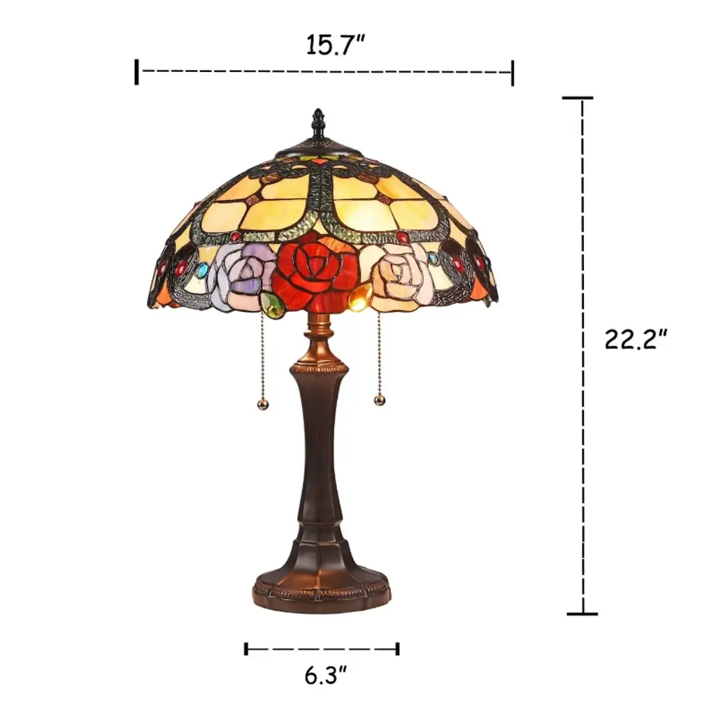 ″ wide shade features intricately stained glass petals in soft amber, green, and cream, meticulously arranged over 60 hand-cut pieces. Resting on a stately dark bronze metal base, this lamp stands approximately 22″ tall and measures 16″ in both shade diameter and depth. Perfect for enhancing living rooms, bedside tables, or entryway consoles, it delivers a warm, inviting glow with timeless charm. Key Features: Material: Tiffany‑style stained glass shade with dark bronze metal base Color Palette: Amber, cream, and green floral glass tiles in bronze framework Shade Dimensions: 16″ diameter × approx. 7″ height, composed of 60 individual glass pieces Lighting Configuration: Two E26 sockets (60 W max each) for soft, ambient illumination Controls: Pull‑chain switched for effortless on/off control Finish & Style: Dark bronze base harmonizes with traditional, eclectic, and vintage décor