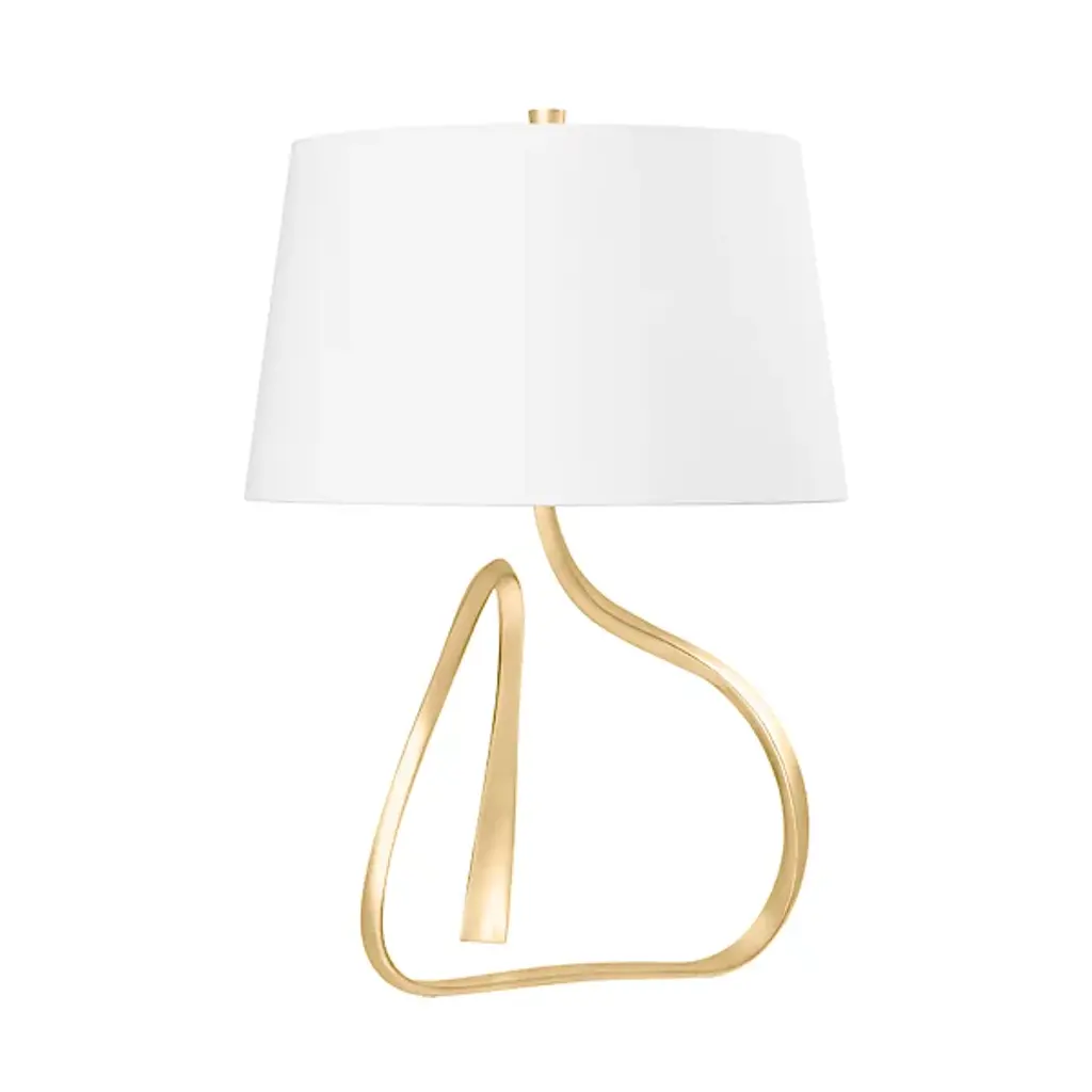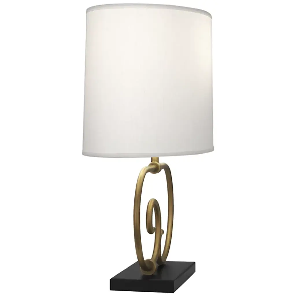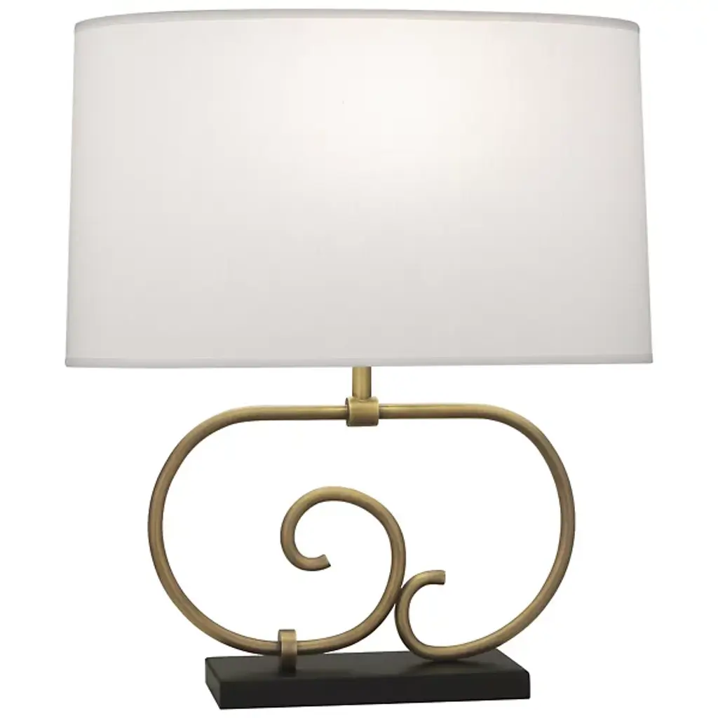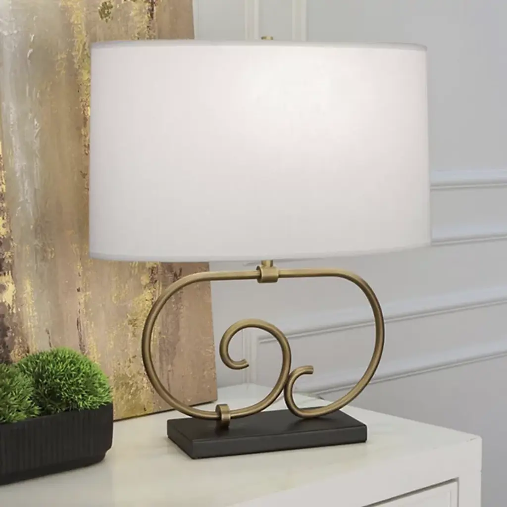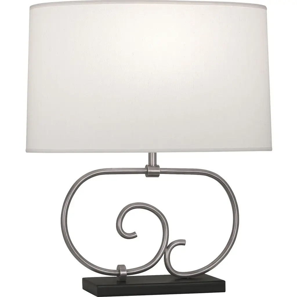 A heartfelt piece, whether on or off. One can’t help but love the curly features and spirited light of the Chloe Table Lamp from Robert Abbey. This chic modern design acts as a beautiful decoration when not in use. It gives off a sculptural appeal with a contoured framework that curves on the inside. This framework impresses with its airy, open feel. The fabric shade on top appears to delicately balance as a generous drum form. This shade sends out a relaxed, diffused glow that accentuates the bold silhouette of the sculpted metal below.
