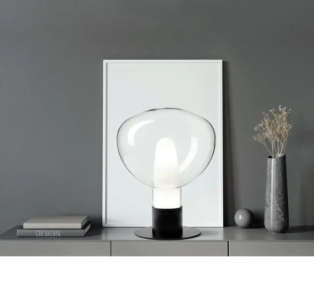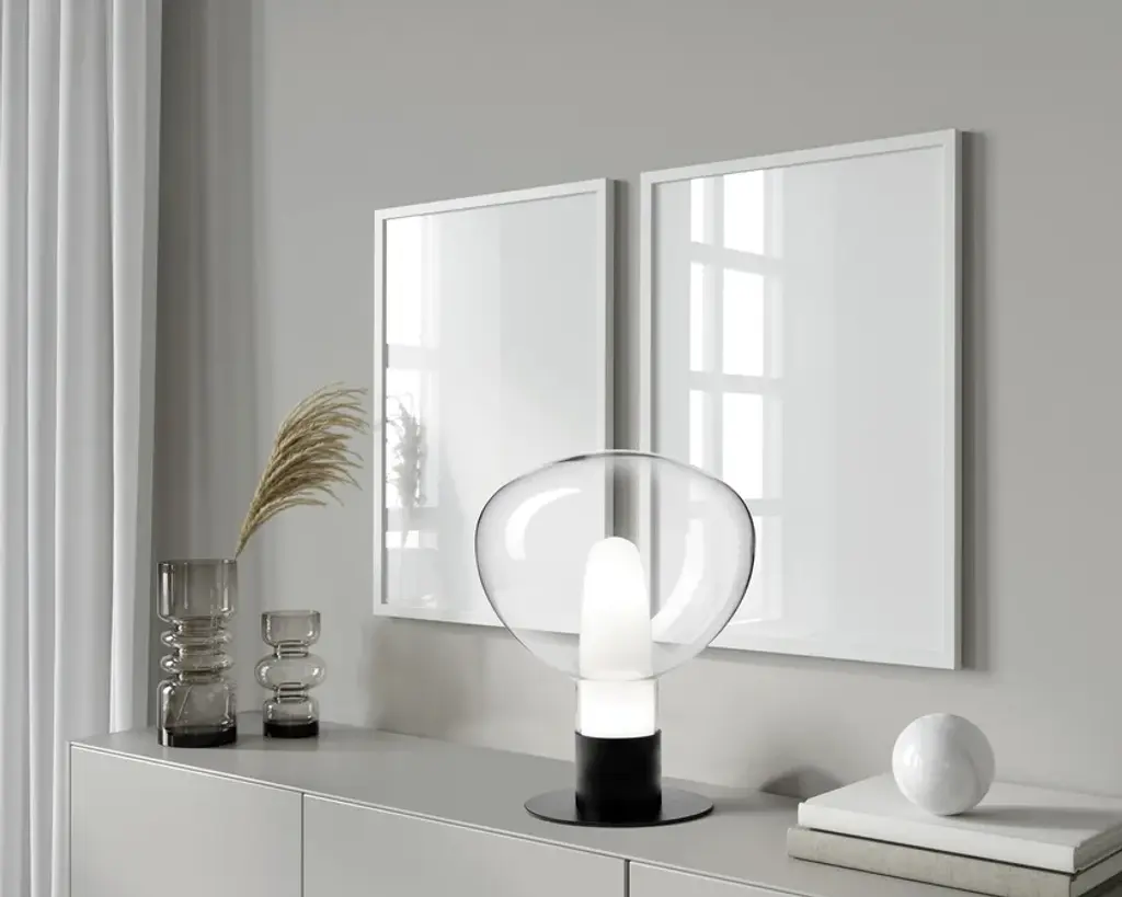 Chobin is a 2-light table lamp made of transparent blown glass on the outside and milk white glass on the inside.Black painted metal support.Cable with dimmer.Source G9 LEDPower 1 x max 10w