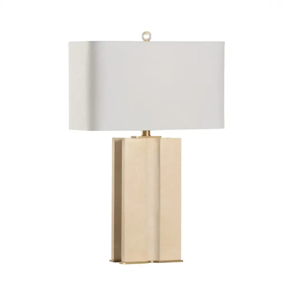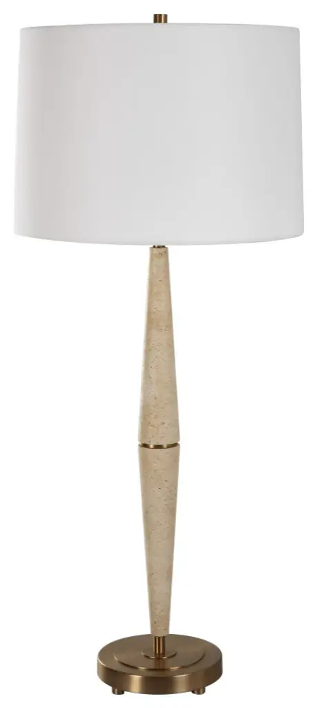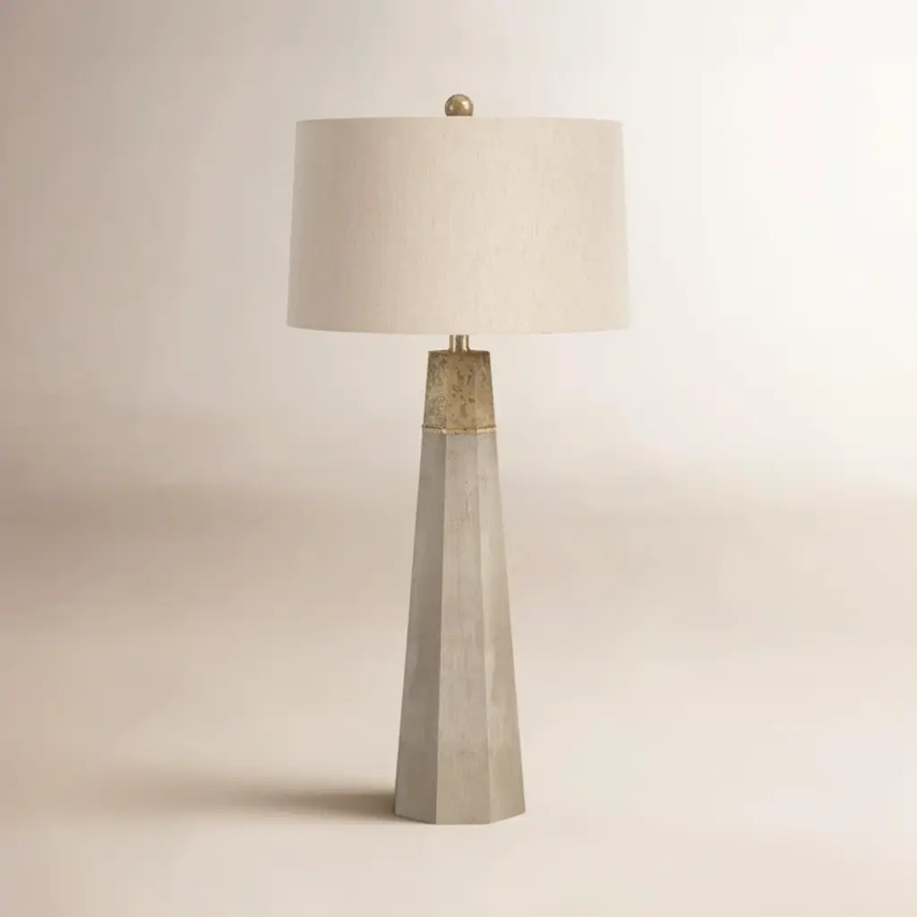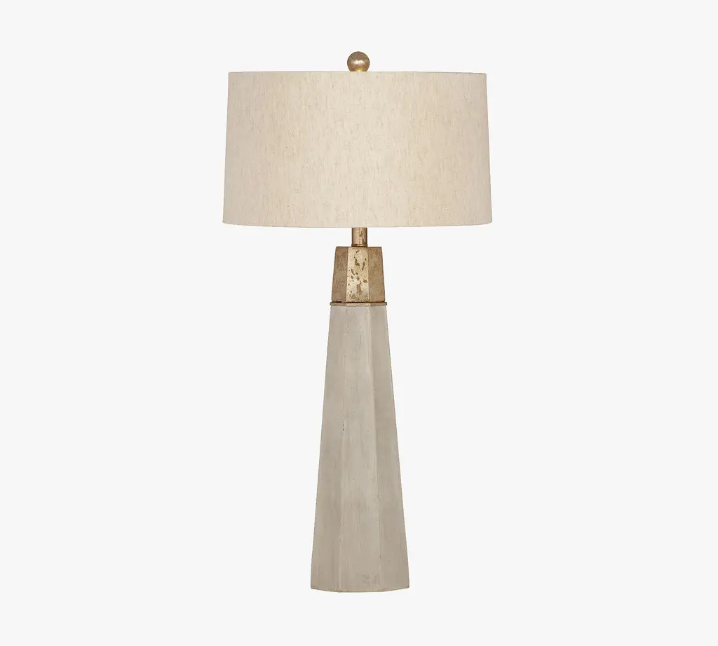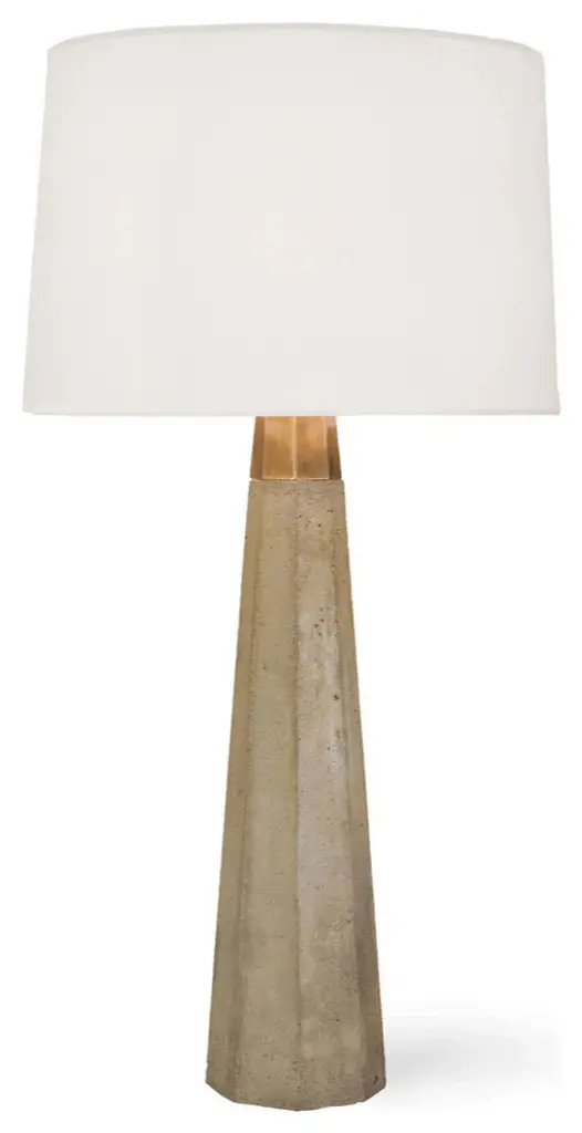 The slightly tapered, modern body of this unique table lamp is designed to reflect light throughout, making it a dynamic addition to any space. The base is crafted of cement with an alabaster finish, and topped with a slightly patinaed gold accent for an extra touch of glamor.