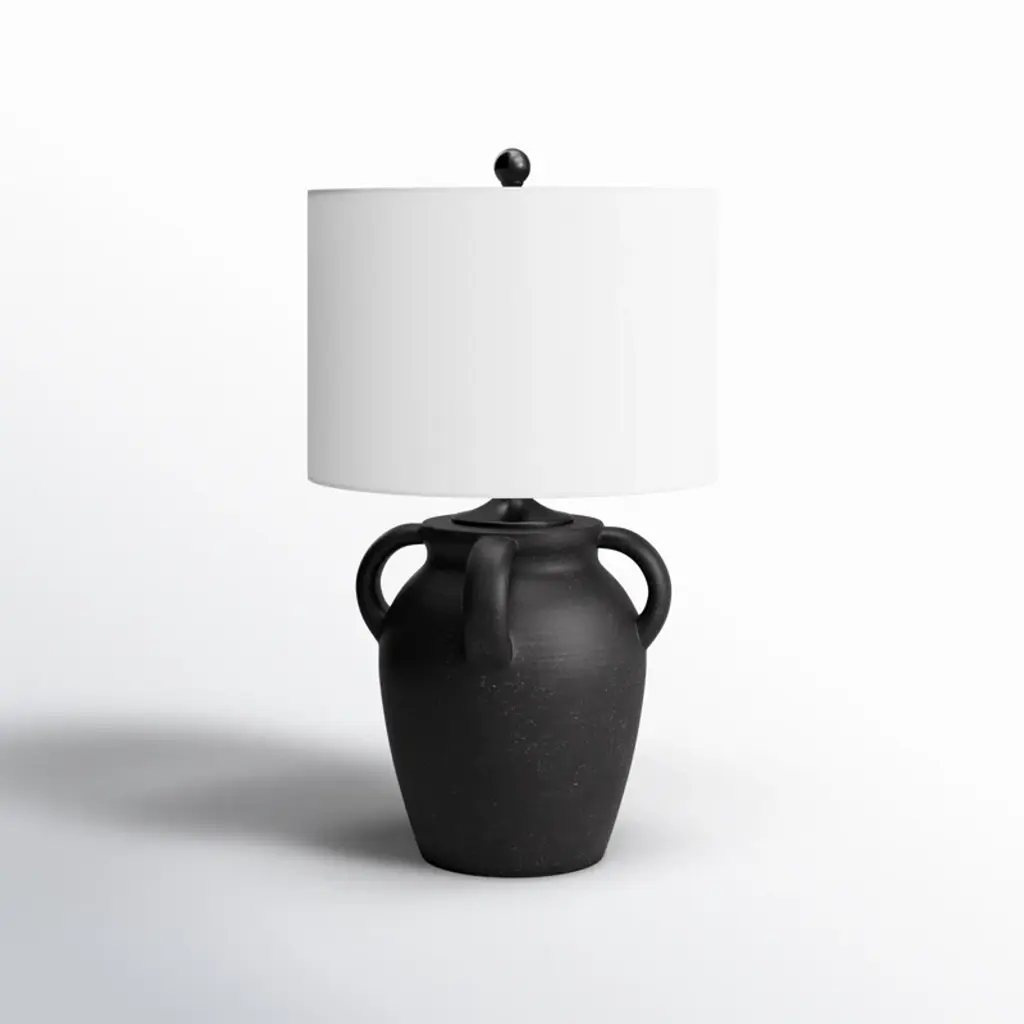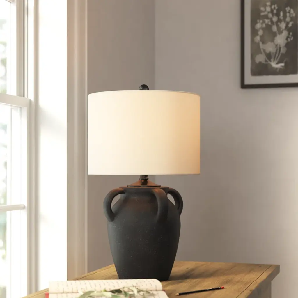 This pottery-inspired desk lamp adds an artful to any room. Drawing inspiration from an antique jug, it features a sculptural silhouette with statement-making handles and voluminous curves, all accentuated by a lustrous black finish. The ceramic base is paired with a 100% cotton white drum shade, adding a refined contemporary touch that complements both traditional and transitional spaces. Plus, it comes with the required bulb, so you can use it right away.