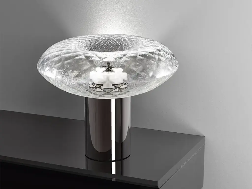 Cicla is a table lamp with indirect light, and is part of homonymous collection of Italamp. It is characterized by a diffuser in fine blown glass and a metal base with chrome finish, also available in iron grey version.Electrical and technical characteristicsLED: 21wLumen: 2500Temperature: 3000 KCRI>80Driver: DALI included (not dimmable)Energy class: A++IP20Certifications: CE/EACCicla collecion offers an elegant look that will impress with its circular blown glass diffuser that is accented by the details in iron grey or chrome metal finish.It is made with the highest quality materials, showcasing the elegance and beauty of each element in all its versions: suspension, ceiling and table lamp in smoked, white or transparent glass.