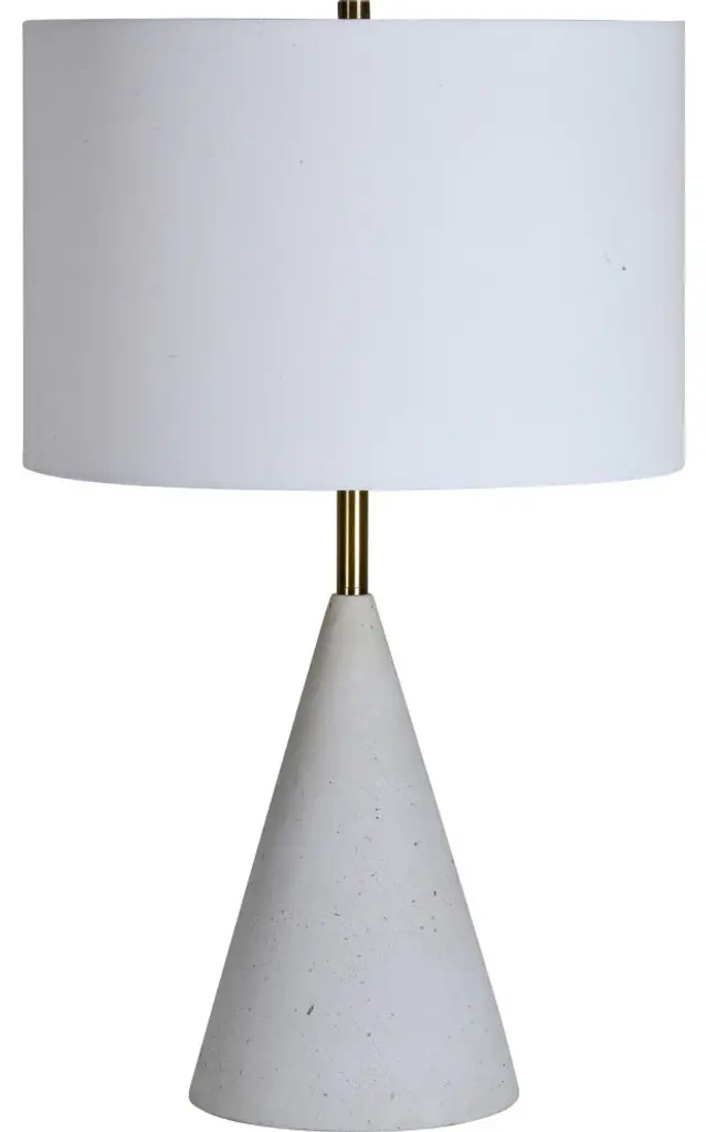 A cone shaped speckled terrazzo base makes this table lamp stand out. The antique brushed brass iron structure is topped with an off-white cotton shade. The three-way switch allows you to control the ambiance in the room. Number of Bulbs: 1 Bulbs Included: No Bulb Wattage: 100 Bulb Type: Incandescent