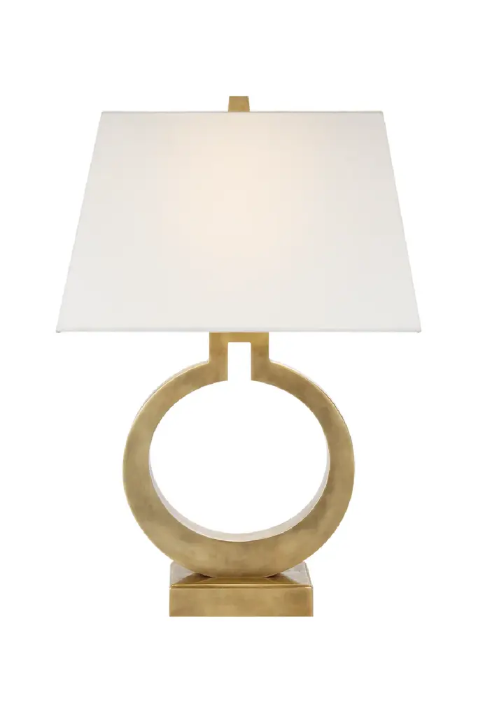 A characterful table lamp, fashioned into a ring with a linen shade. Ring creates interesting shapes in a room, where the circular base contrasts with the strong geometric shade.