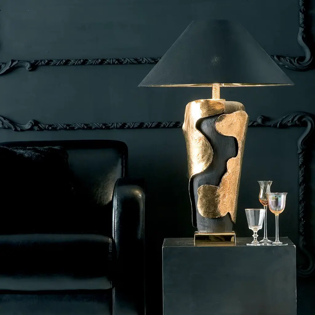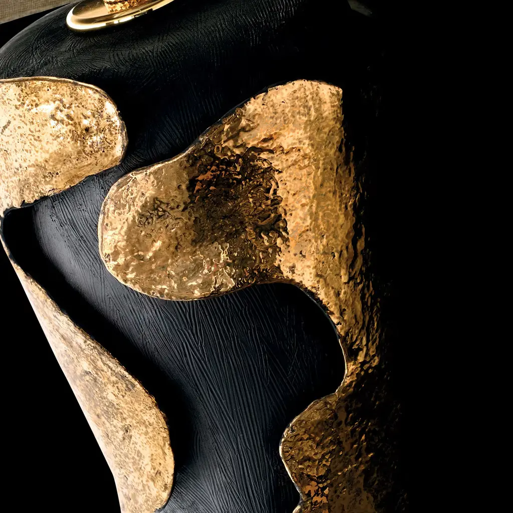 This refined, distinctive lamp will be an eye-grabber in any room of the house. The hand-carved black body is covered with a layer of majolica plated in pure gold, while the base is gold-plated brass and the lampshade made in fine black chintz and golden inside. Also available in brown. Contract and commercial certifications available upon request.