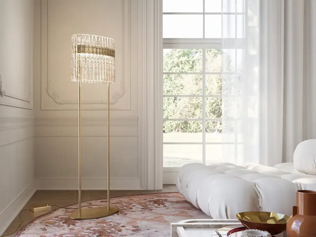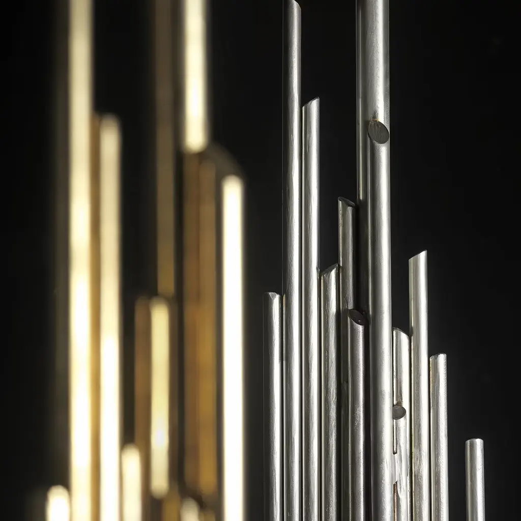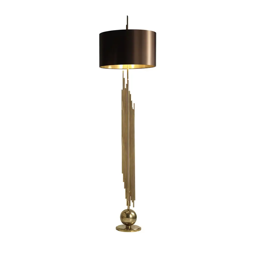This lamp was crafted using gold-plated iron components that were soldered together by hand. The body consists of a flat round base with a spherical element and an irregular configuration of tubes as the protagonist. The shade is in a rich brown silk and the interior of the shade is in reflective gold. This piece can be paired with the Z500 Floor Lamp to make a statement in any room in the home.
