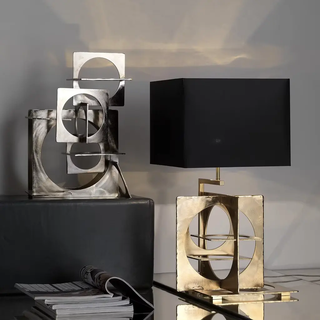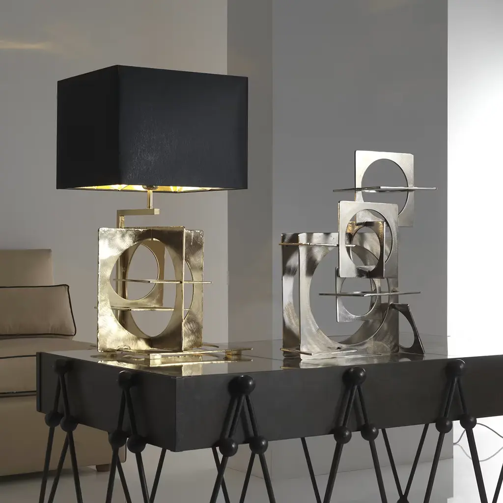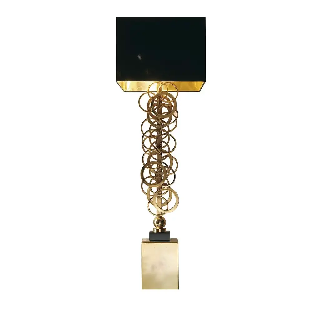This exquisite lamp features a unique construction crafted entirely in iron which was hand wrought and engraved. Its finish is in a lustrous gold color that will add a touch of shimmering luxury to any home when placed in a living room, bedroom, or even an entryway. The sophisticated shade is in black with a golden exterior, perfectly reflecting the light for ultimate illumination. The classic black and gold combination makes this piece a timeless addition to any home.