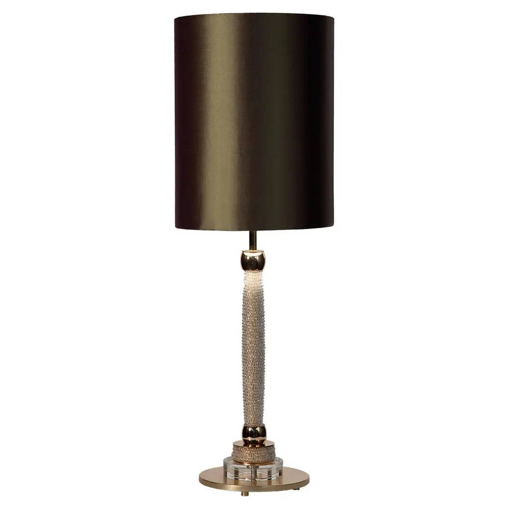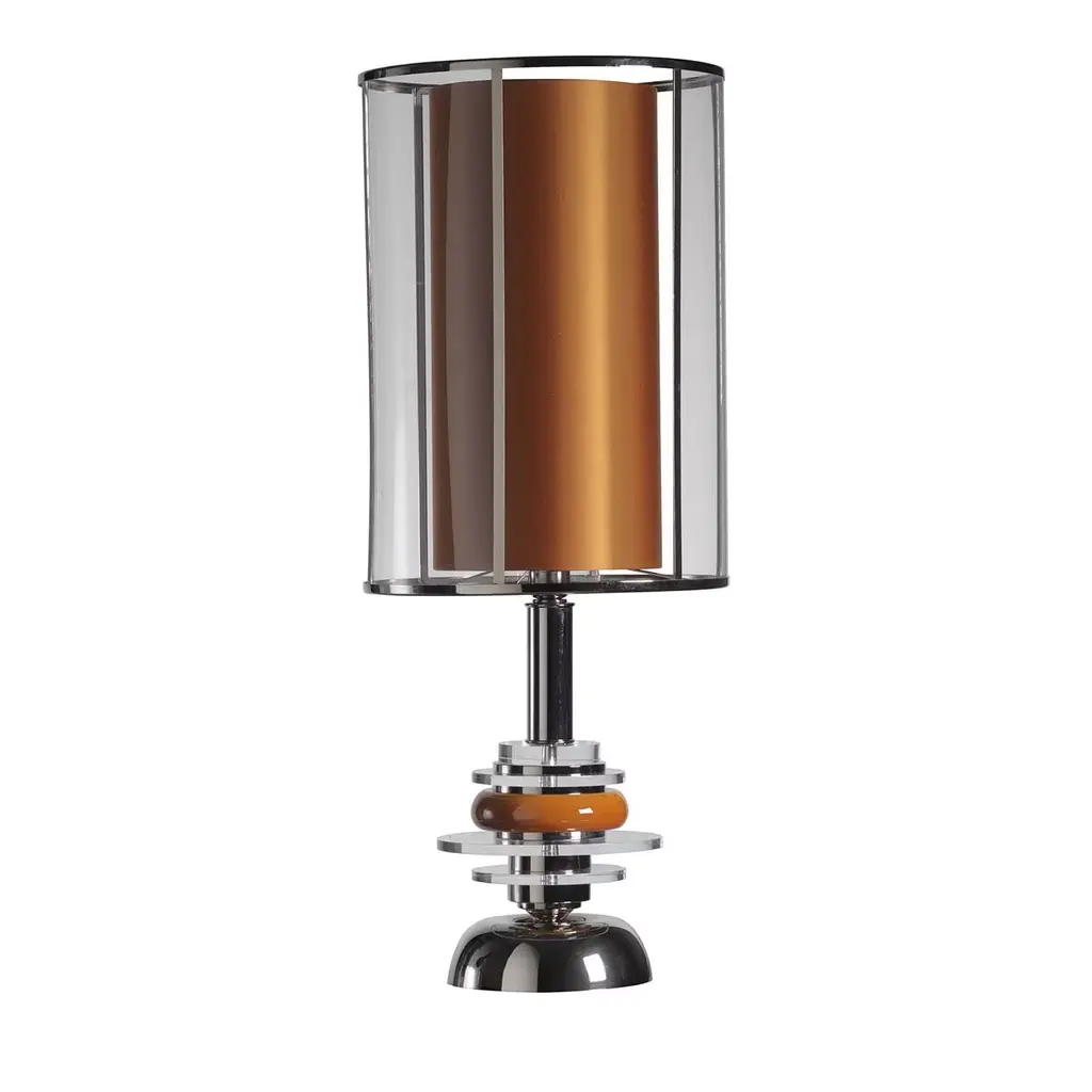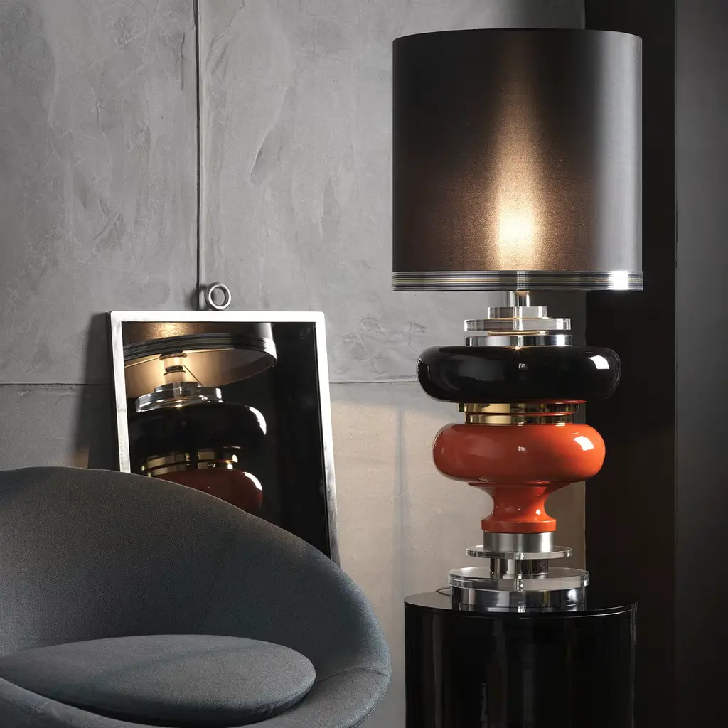 This table lamp's light seems to burn like a flame behind its black silk frame. Its structure features black and orange-colored, glazed majolica pottery, along with plexiglass and nicklel- and gold-plated brass. This item adds a touch of warmth, as well as illumination.