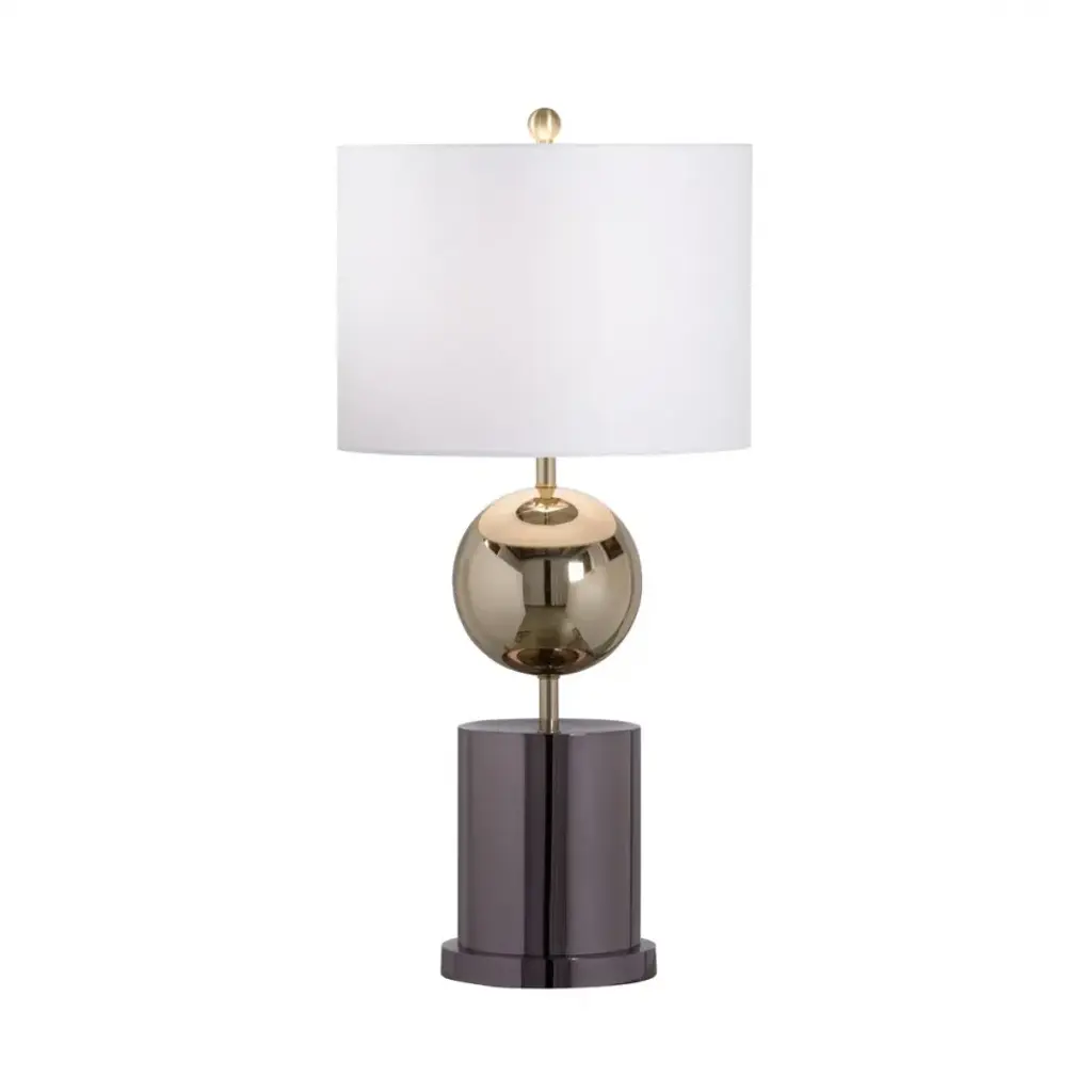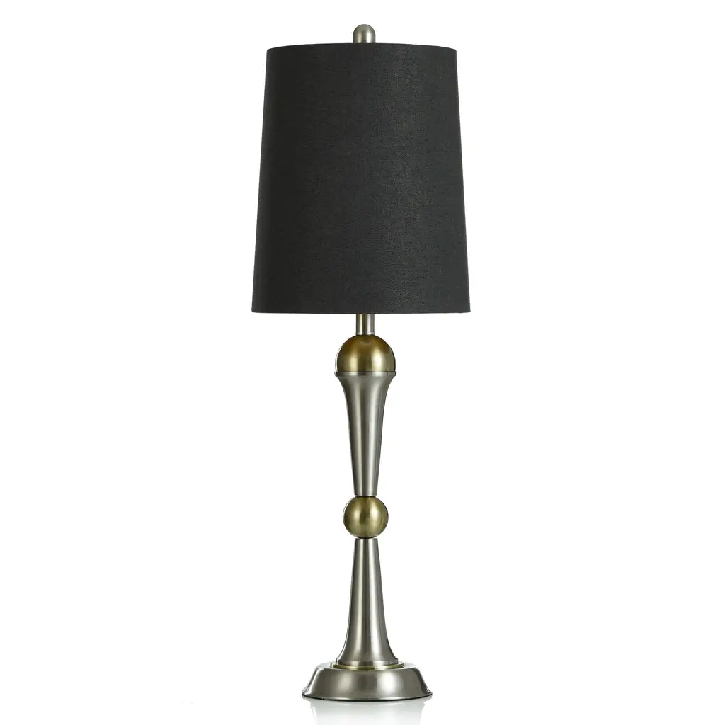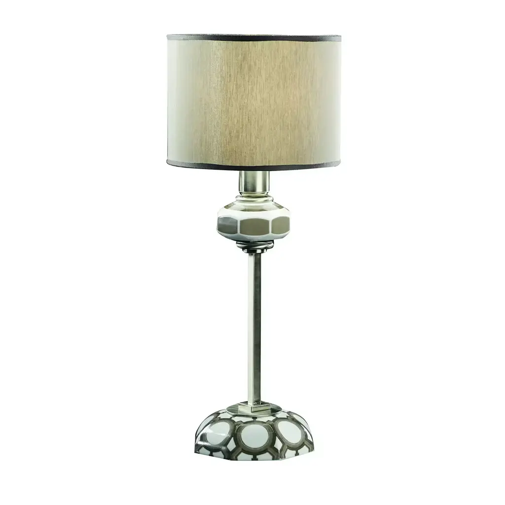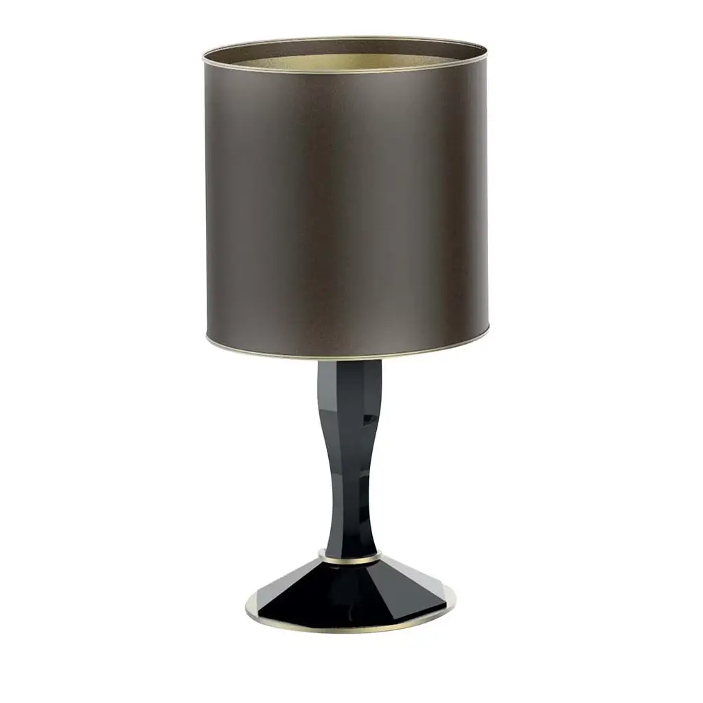 This table lamp's light seems to burn like a flame behind its black silk frame. Its structure features black and orange-colored, glazed majolica pottery, along with plexiglass and nicklel- and gold-plated brass. This item adds a touch of warmth, as well as illumination.