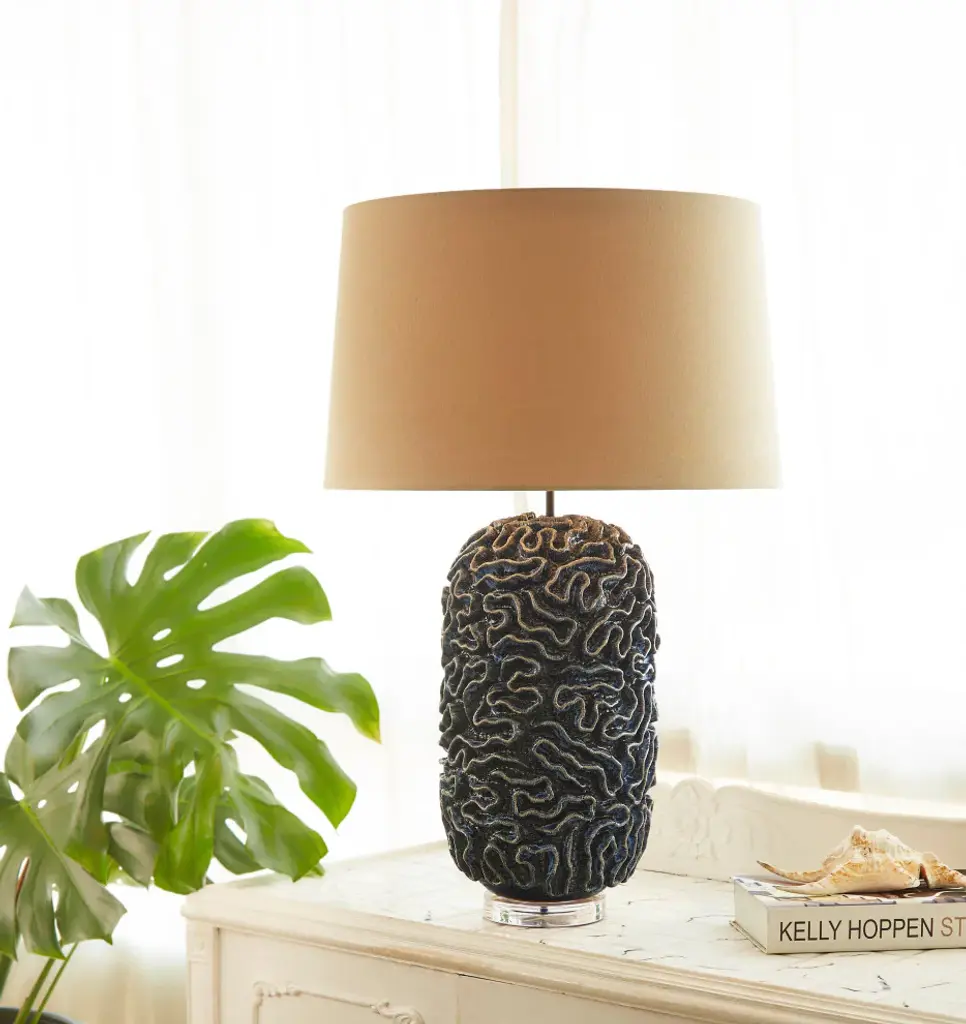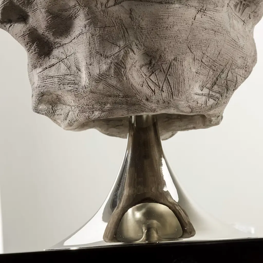 Conceived as a fascinating hybrid between a lamp and a sculpture, this design makes for a superb addition to a sideboard or dresser one wants to enrich with a singular decorative twist. Nickel-finished bronze-casted elements recalling a trumpet flank an irregular mass in refractory ceramic showcased in its unrepeatable texture. A soft-brown chintz shade seals the design.