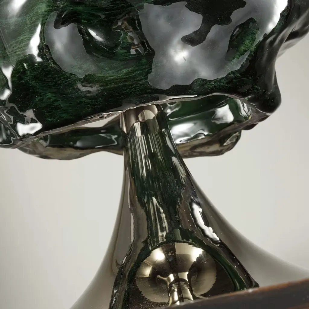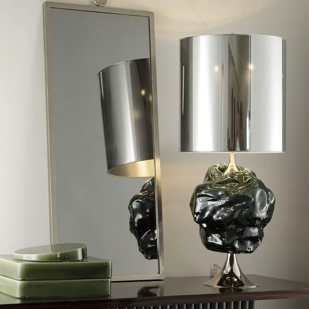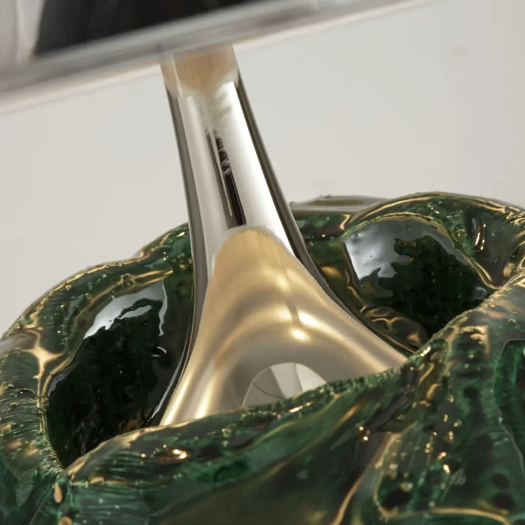 A stylish aesthetic of extraordinary sculptural impact defines this table lamp, a singular piece standing out for its irregular refractory ceramic mass element, seemingly crumpled and finished with a deep green glaze. The trumpet-like structure it is mounted on flaunts a polished nickel finish that perfectly harmonizes with the one selected for the drum polycarbonate shade.