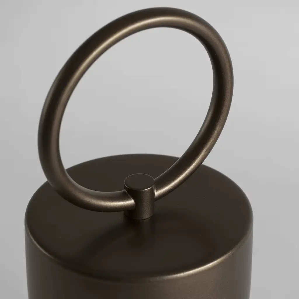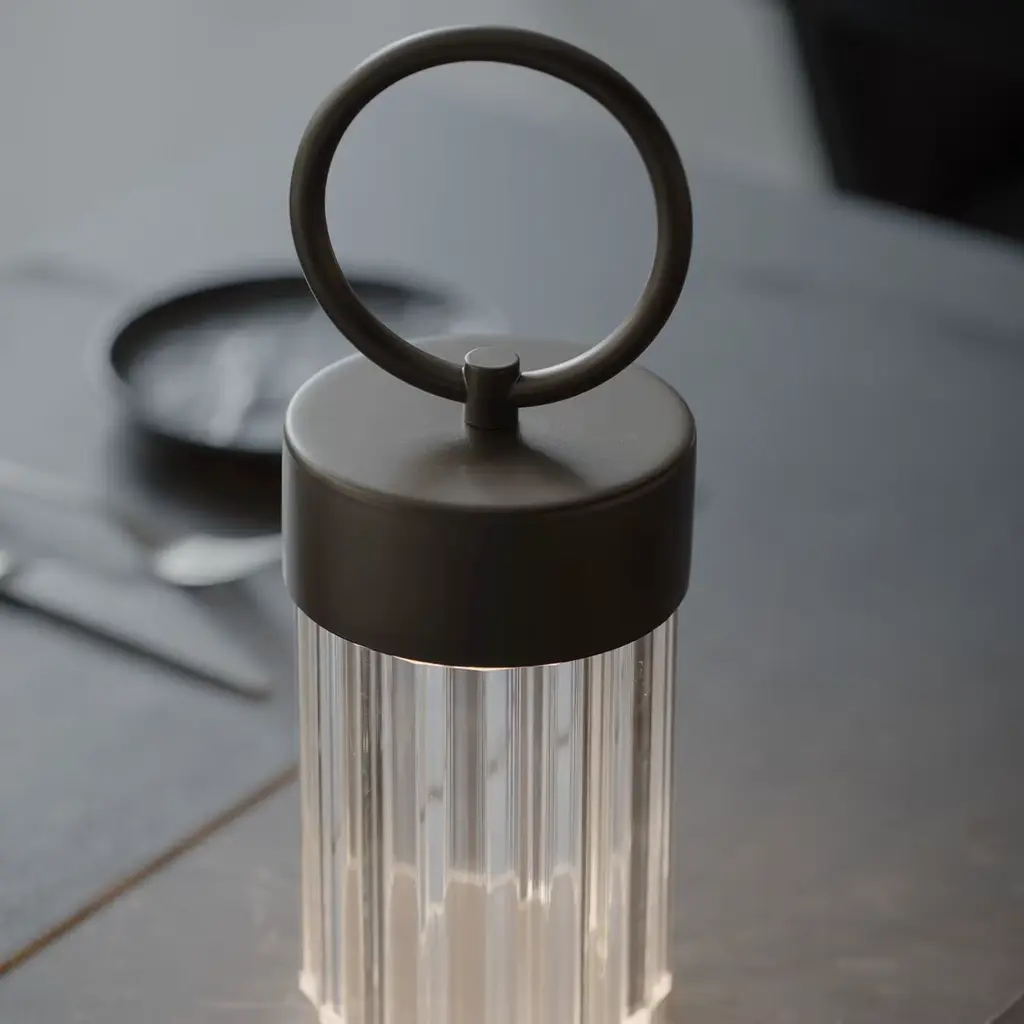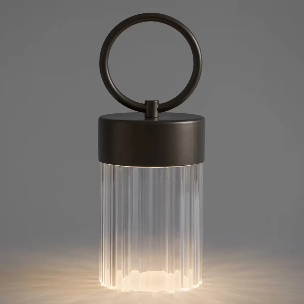 The Claretta portable lamp features a lacquered bronze frame paired with a transparent ribbed plexiglass diffuser that enhances light diffusion. Its compact design includes an integrated circular handle, enabling easy portability and versatile placement. Suitable for both indoor and outdoor use, this lamp combines functional lighting with an elegant aesthetic, balancing modern technology with refined materials for a sophisticated ambient glow. Designed by Chiara Caberlon. Additional finishes are available in the Artemest catalogue.