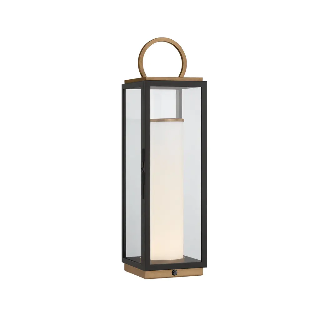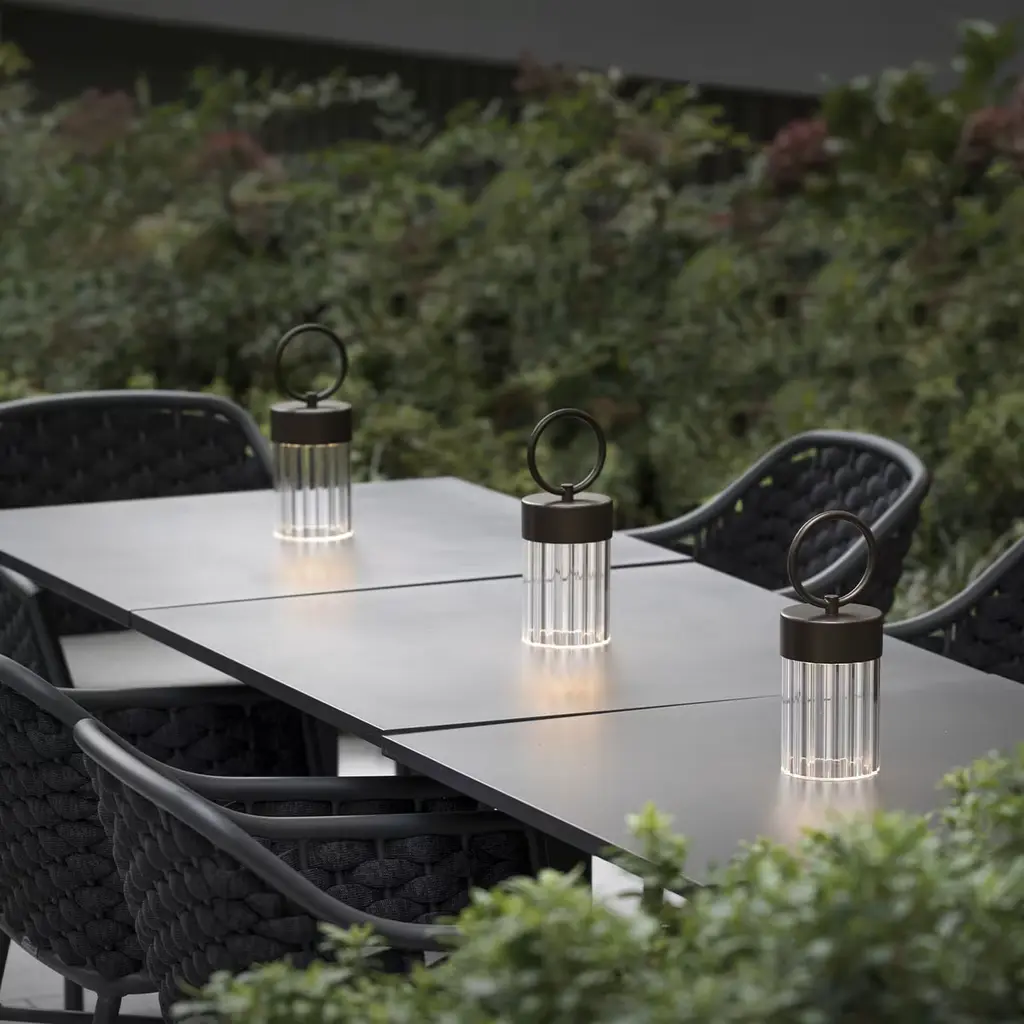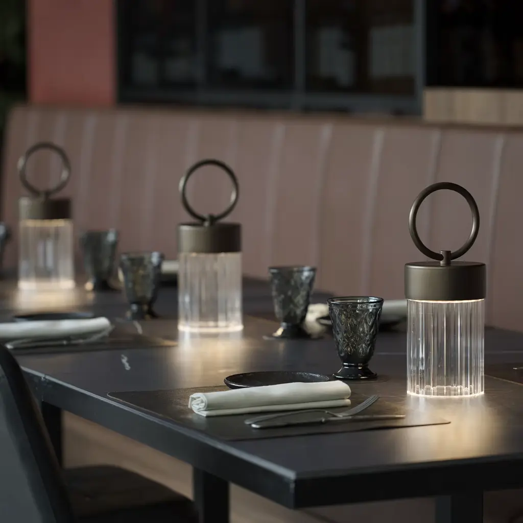 The Claretta portable lamp features a lacquered bronze frame paired with a transparent ribbed plexiglass diffuser that enhances light diffusion. Its compact design includes an integrated circular handle, enabling easy portability and versatile placement. Suitable for both indoor and outdoor use, this lamp combines functional lighting with an elegant aesthetic, balancing modern technology with refined materials for a sophisticated ambient glow. Designed by Chiara Caberlon. Additional finishes are available in the Artemest catalogue.