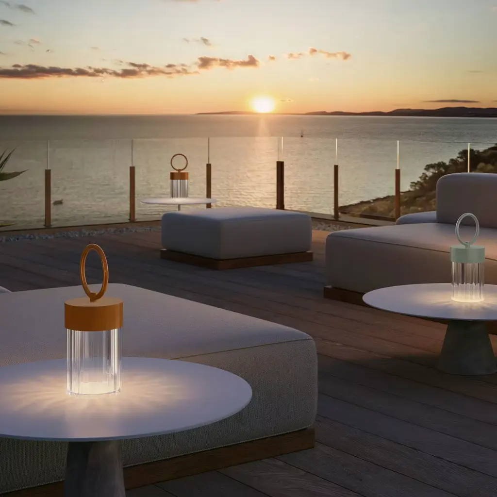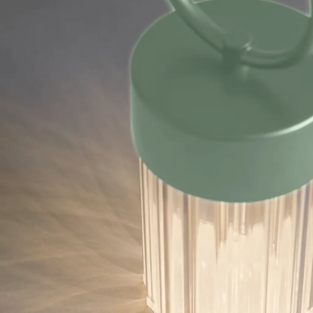 The Claretta portable lamp by Chiara Caberlon features a sage green frame paired with a transparent ribbed plexiglass diffuser. Designed for portability and ease of use, this medium-sized lamp offers versatile lighting with a contemporary aesthetic. Its battery operation allows for flexible placement without the need for a power outlet, making it ideal for both indoor and outdoor settings. The ribbed diffuser adds texture and diffuses light softly for a pleasant ambience. Additional finishes are available in the Artemest catalogue.