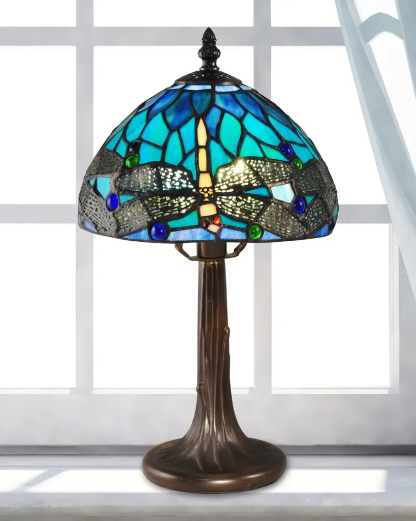 The shade of the Classic Dragonfly Accent Lamp is hand made using the traditional copper foil technique. The colors and shape of individual hand rolled art glass of the Classic Dragonfly Accent Lamp will not just illuminate but decorate any space in your home.Number of bulbs: 1Wattage: 60WBase Material: MetalBase Finish: Antique BrassPower Cord: Plug-inSocket: E12 CandelabraUL and cUL approved for dry environment