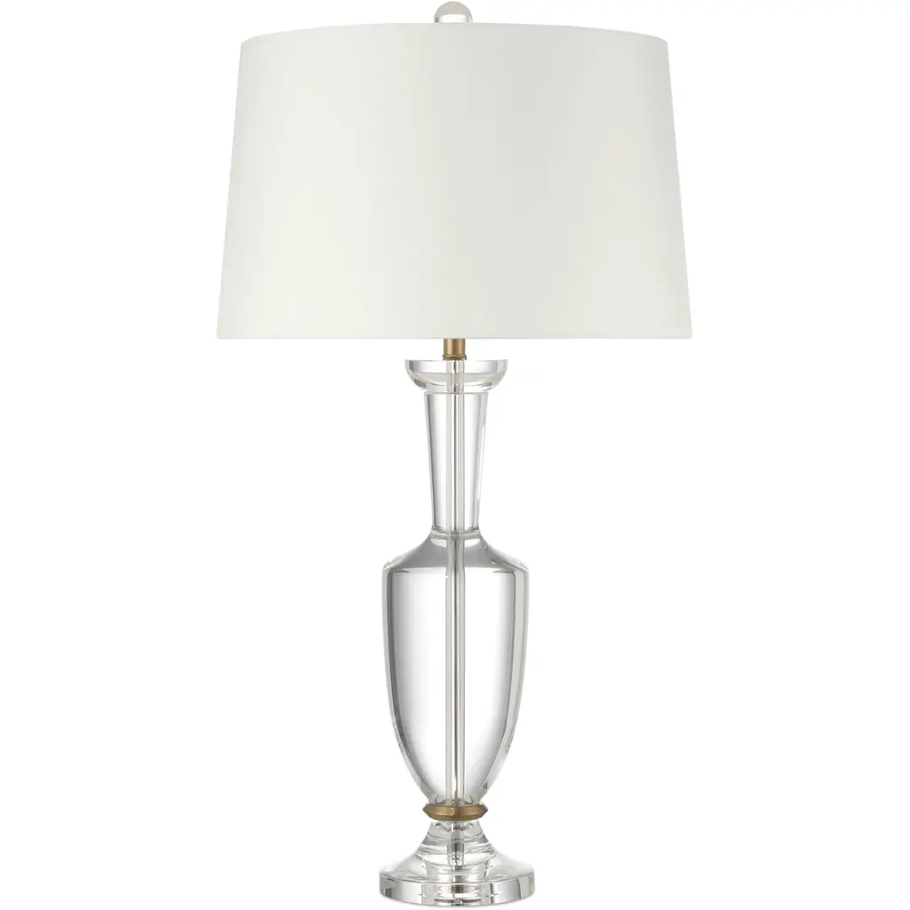 The Classico Table Lamp is composed of two pieces of optic crystal that are joined near the base by a metal ring in a natural brass finish. Its elegant profile is modeled after a 19th-century baluster-shaped vase, drawing inspiration from the Zanfirico tradition of glassblowing. The clear crystal body allows light to interact with it to lend it a sophisticated presence.