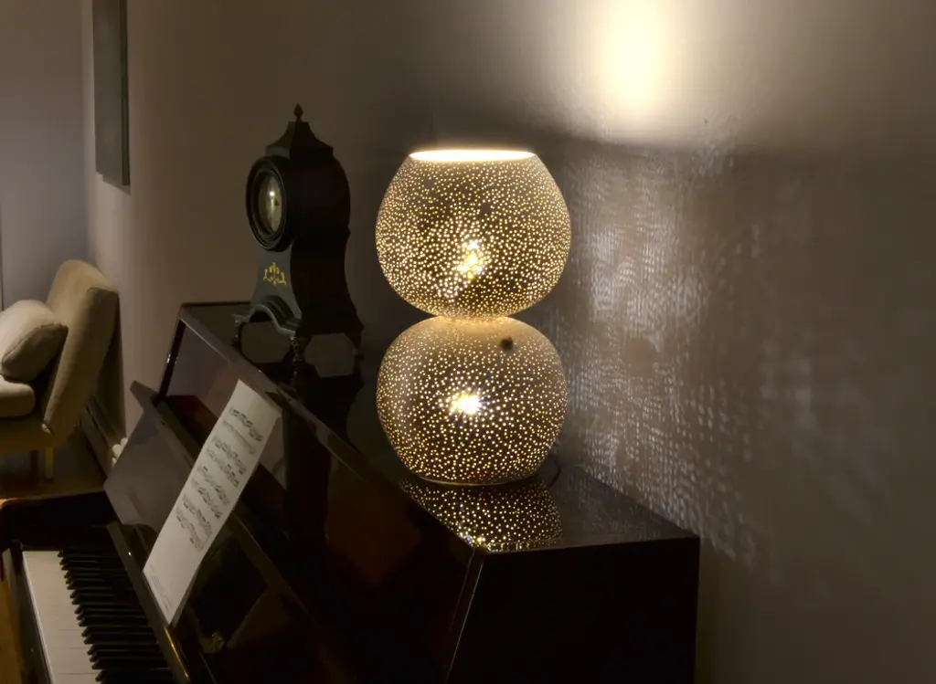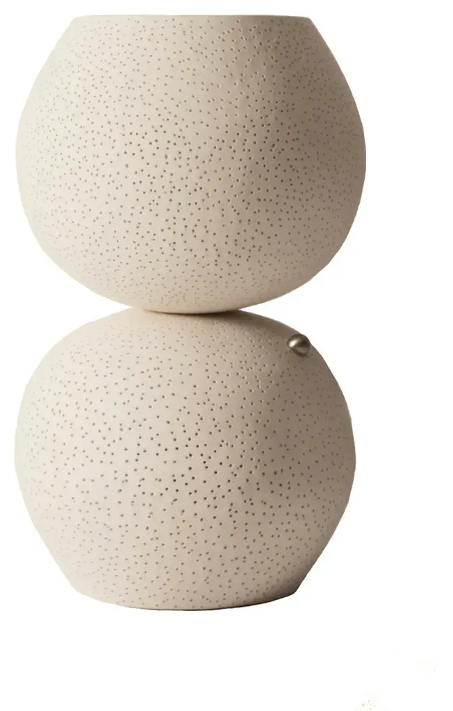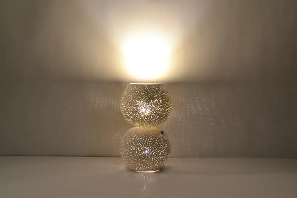 This Claylight Table lamp is made of two reflected white ceramic orbs, handmade in NY.Lamp Size: 12" high, 7" diameterCord 60'''' The small metal knob acts as a touch dimmer - One short touch for on or off, one long touch dims it down or up.It''s an excellent bedside lamp, office lamp or a or a living room light.- LED bulbs: supplied with 2x6W LED bulb that is eight times more efficient in it''s energy use than a regular incandescent, has a longer life span of 50,000 hours and a warm light color (2900K).LED bulbs are California title 20 compliant.This table lamp is dual voltage and can work both in US 110V and in Europe/Australia/Asia 220-240 Volt