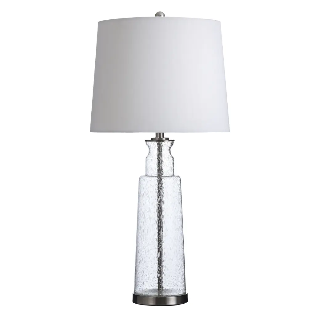 This captivating table lamp shows off distinctive and tasteful modern design. This piece demands attention with seeded glass and chrome finishes, making the perfect contemporary table lamp. Placing this table lamp in your home will tastefully transform your modern space with elements of high-end minimalist design.Features - Due to the production process, each piece is unique and no two are exactly alike.This beautiful table lamp is crafted from seeded glass and finished with brushed nickel accents.Topped with a white tapered drum shade, this table lamp showcases a high-end modern design.Number of Bulbs: 1Wattage: 150WBulb Type: Incandescent, Fluorescent, or Equivalent.Bulb(s) not includedDue to lighting and monitor differences, actual colors and finishes may vary slightly from what appears online.