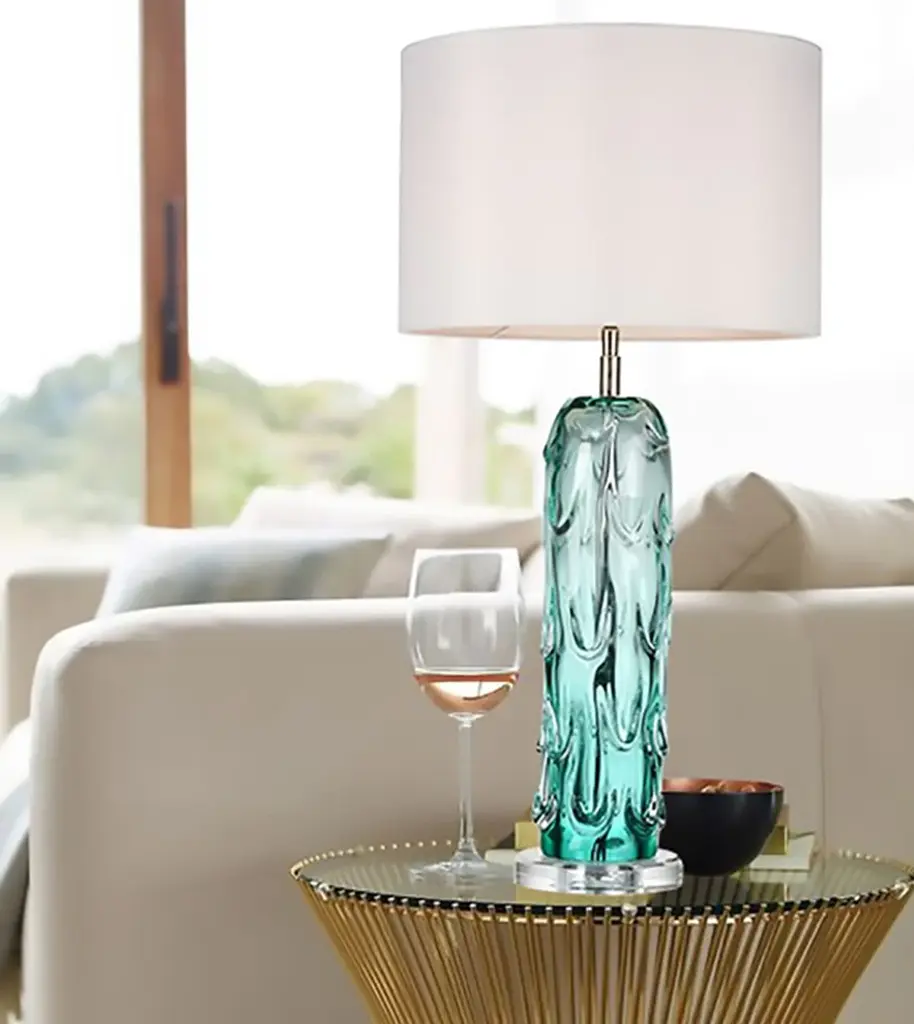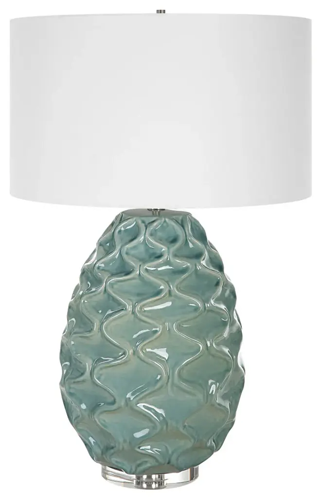 Clear Blue Waterfall Inspired 29 Inch Modern Relaxing Decor Lamp Flambeau Collection By Lucas McKearn LightingBeautifully designed, our Ponchatrain glass table lamp flaunts a peaceful clear blue hue that adds a soft touch of color to your space. The white drum-shaped shade tastefully accents the base, while softly filtering the light, giving off a warm glow. Easily adding a relaxing bit of color to your interior space, the Ponchatrain Lamp sits atop a clear circular acrylic base that shows off the cascading aqua shaped column, catching the light by day and creating a stunning evening spectacle when lit.• Bulb Type:Medium• Number of Bulb(s):1• Bulb(s) Included:No• UL Listed:Yes• Bulb Wattage:100• Plug