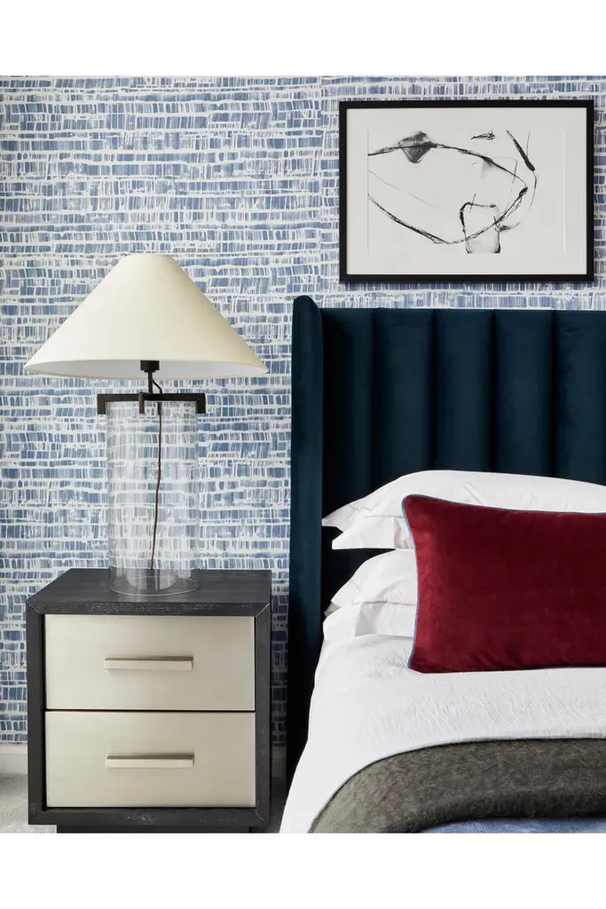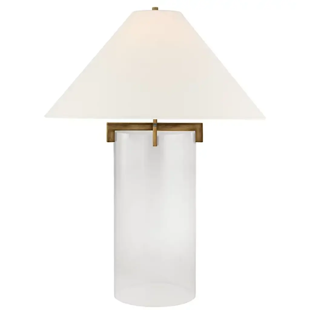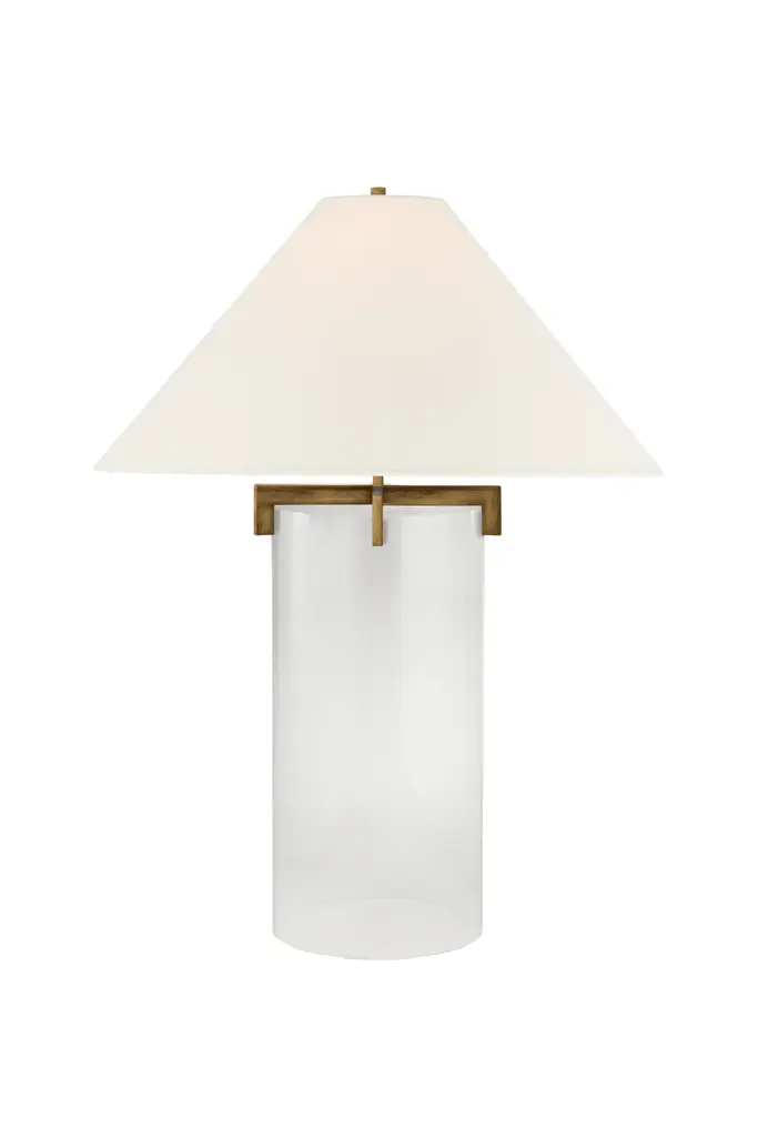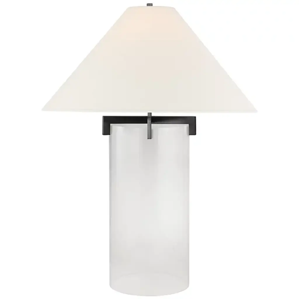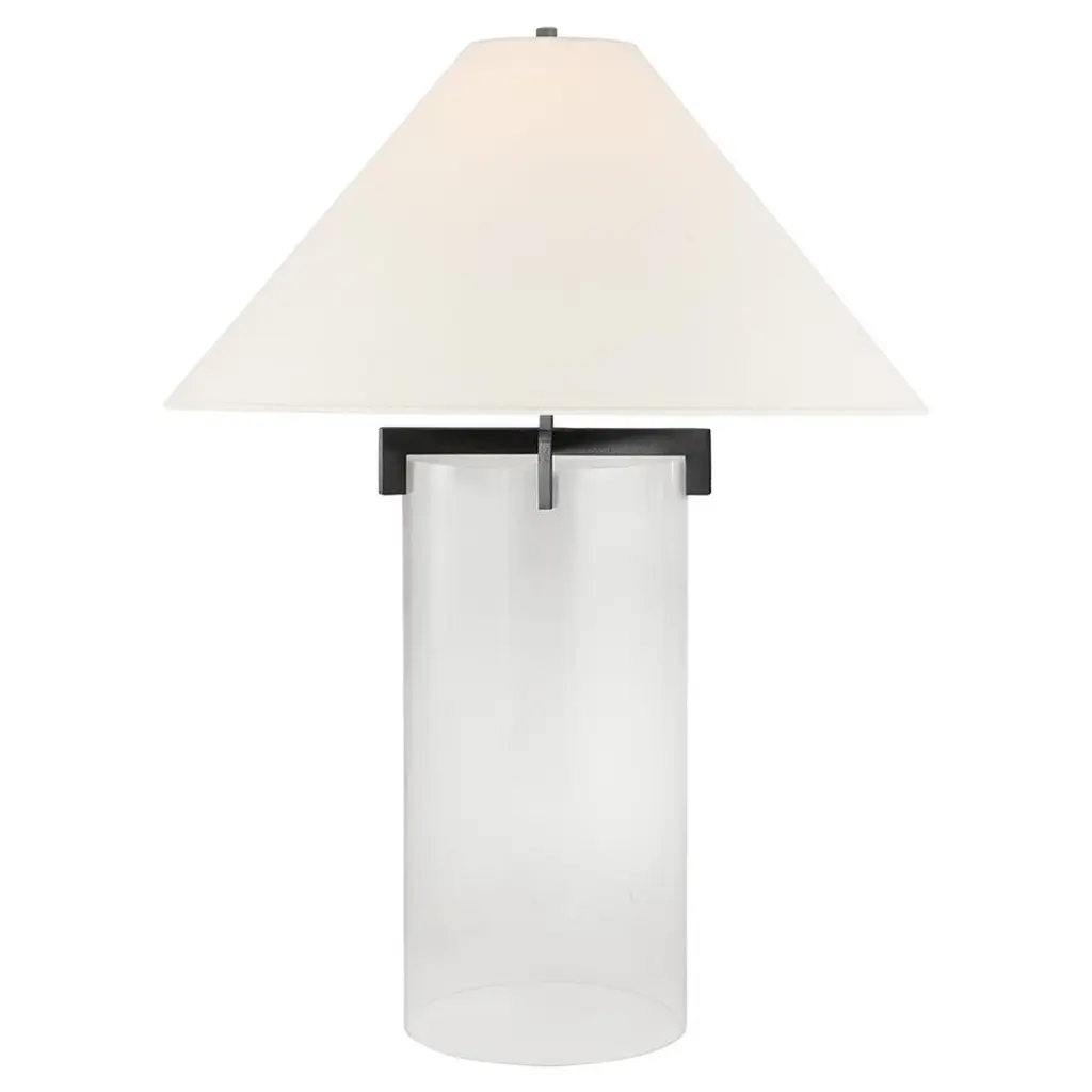 Brooks shows sleek modern lines with a completely clear, transparent crystal base, a cream linen shade and black iron finishings. Designed by J. Randall Powers, Brooks suits smart contemporary interiors, adding sculptural interest and clever visual play with its transparent base.