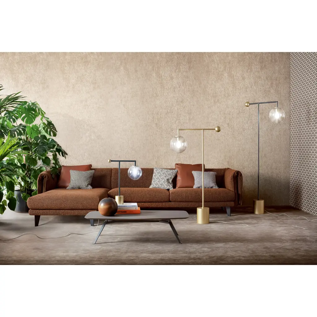 Spherical elements are paired with squared silhouettes to create Bardot, the design lamp which, like its namesake actress, symbolizes timeless beauty thanks to its refined geometric structure. The lamp is enhanced by the stand and globe in metal, for which the precious matt brass finish has been chosen; the wide lampshade consists of a transparent glass globe that allows maximum brightness.