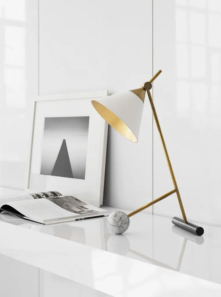 Modern and sophisticated, the Cleo Table Lamp celebrates architectural geometry with a signature use of mixed metals. This bold design showcases sleek conical shades accented by cubes and spheres, lending contemporary sophistication to any room. Its elegant form and striking details make it a standout piece, perfect for adding a touch of modern elegance to your space.