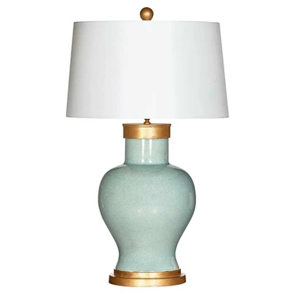 This handcrafted ceramic table lamp features a celadon crackle glaze and gold leaf accents. Topped with a hardback drum shade made of cream linen with hand-rolled edges.