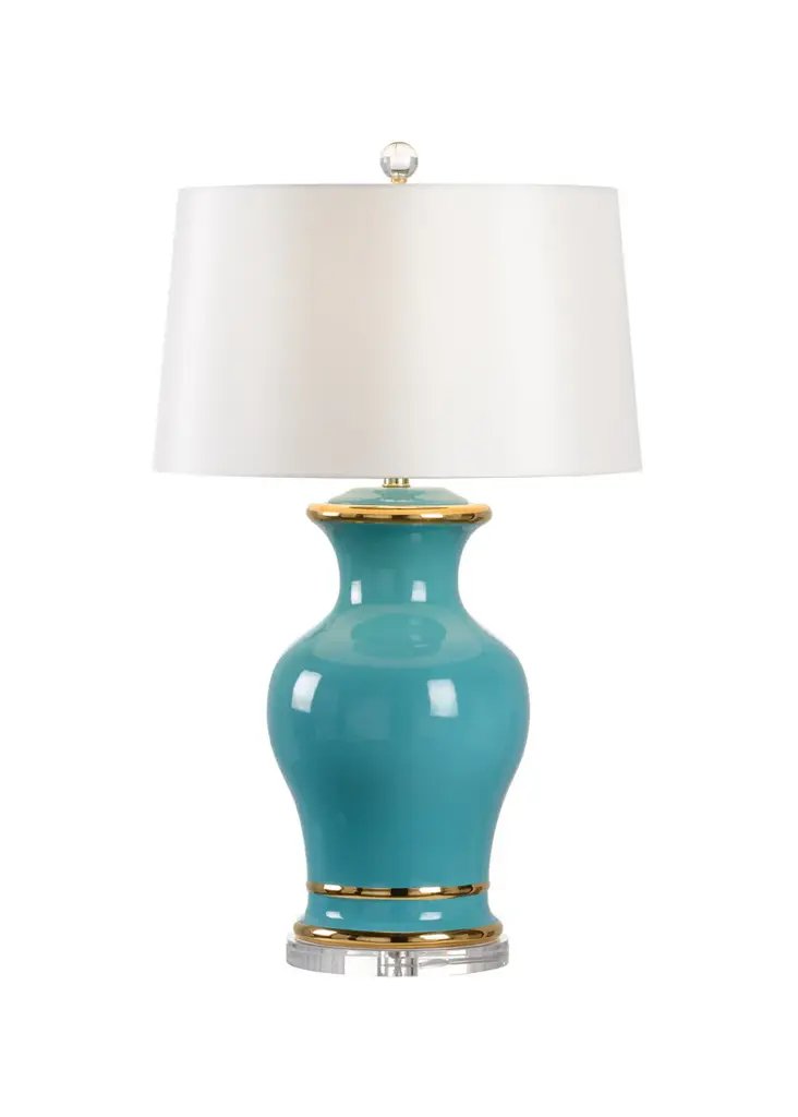 The deep emerald-green color of this jar lamp is enhanced by gold-leaf accents on the base and finial. The hardback drum shade in cream silk features hand-rolled edges. Made in the USA.