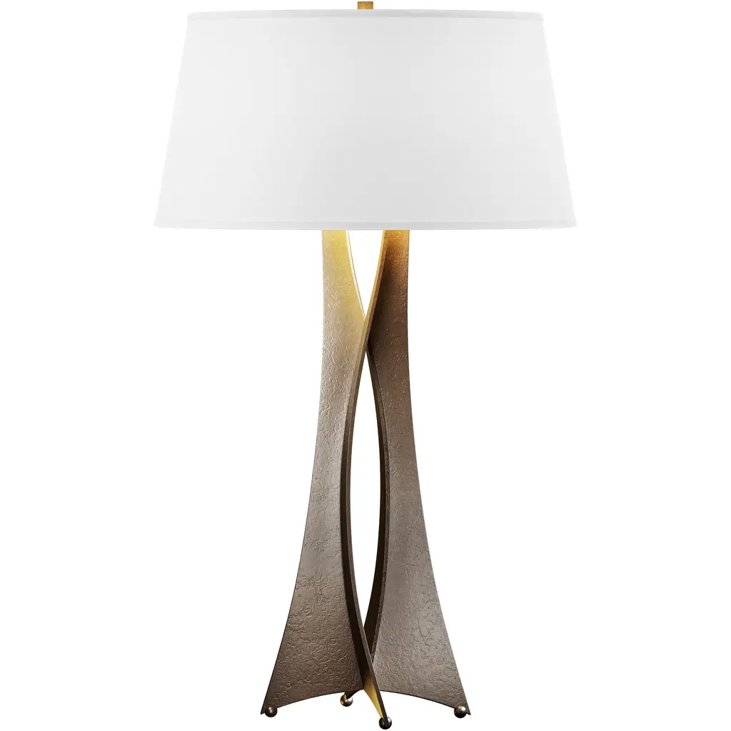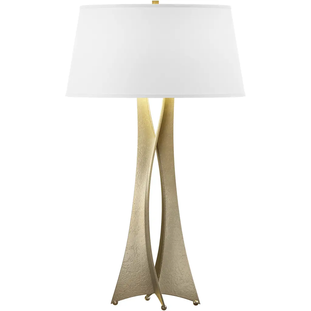 This sleek table lamp will bring Space Age chic to a room. The gilded finish accentuates the metal body's hammered texture, and the tapered linen shade is the perfect finishing touch.
