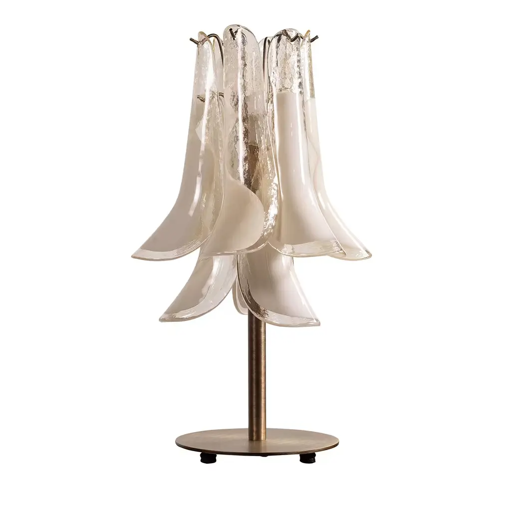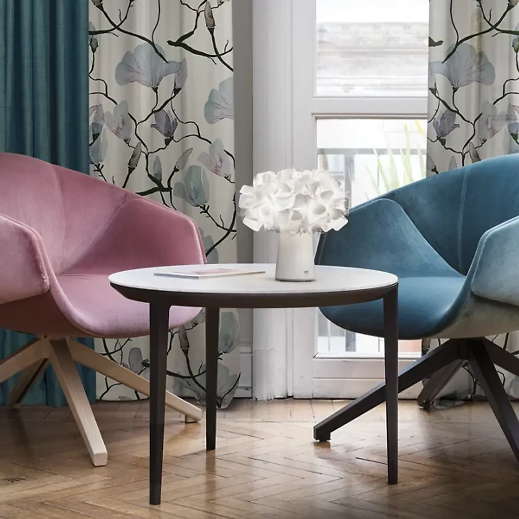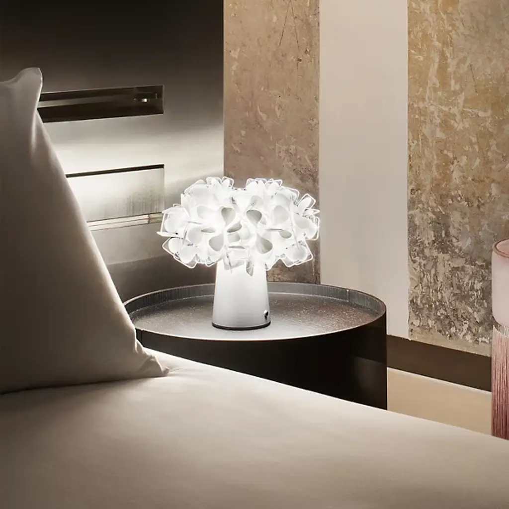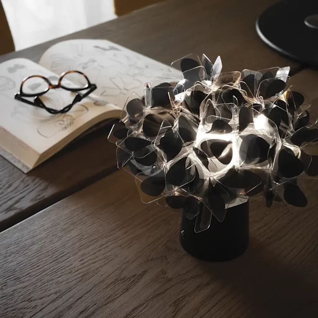 The pillows of nature, from clouds to treetops, inspire the dreamy character of the Slamp Clizia Portable LED Table Lamp designed by Adriano Rachele. It's a portable, rechargeable piece that invites you to bring a touch of wonder to every corner of your home, both inside and out. The piece is elevated by an elegant vase-like base, dotted on the side with a tasteful on/off switch. Shimmering feathery shapes of printed Cristalflex dance around each other with fine edges; they are arranged like a beautiful bouquet by hand. Clean, romantic light permeates from the piece, creating a fascinating show of textured light and shadow.