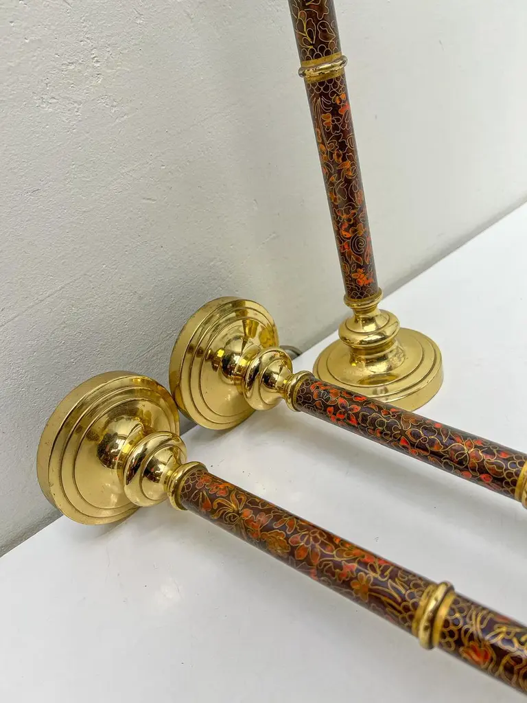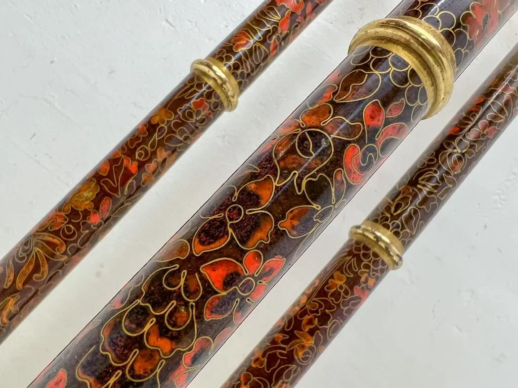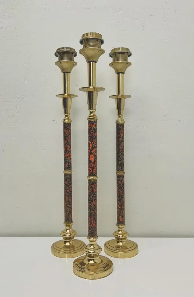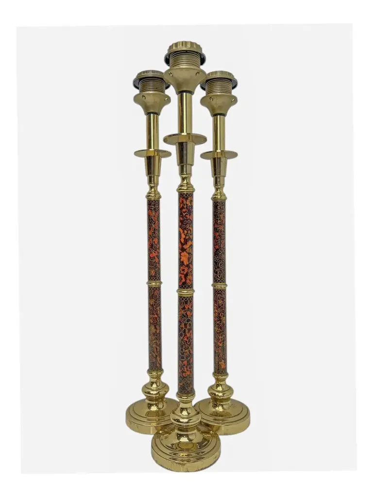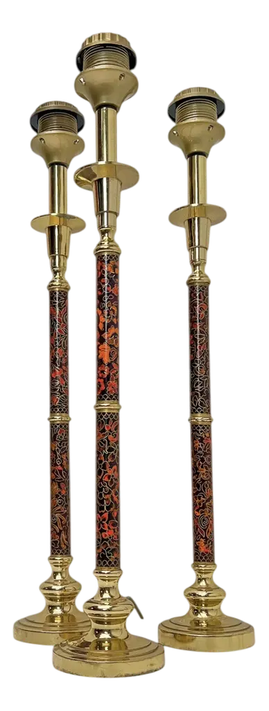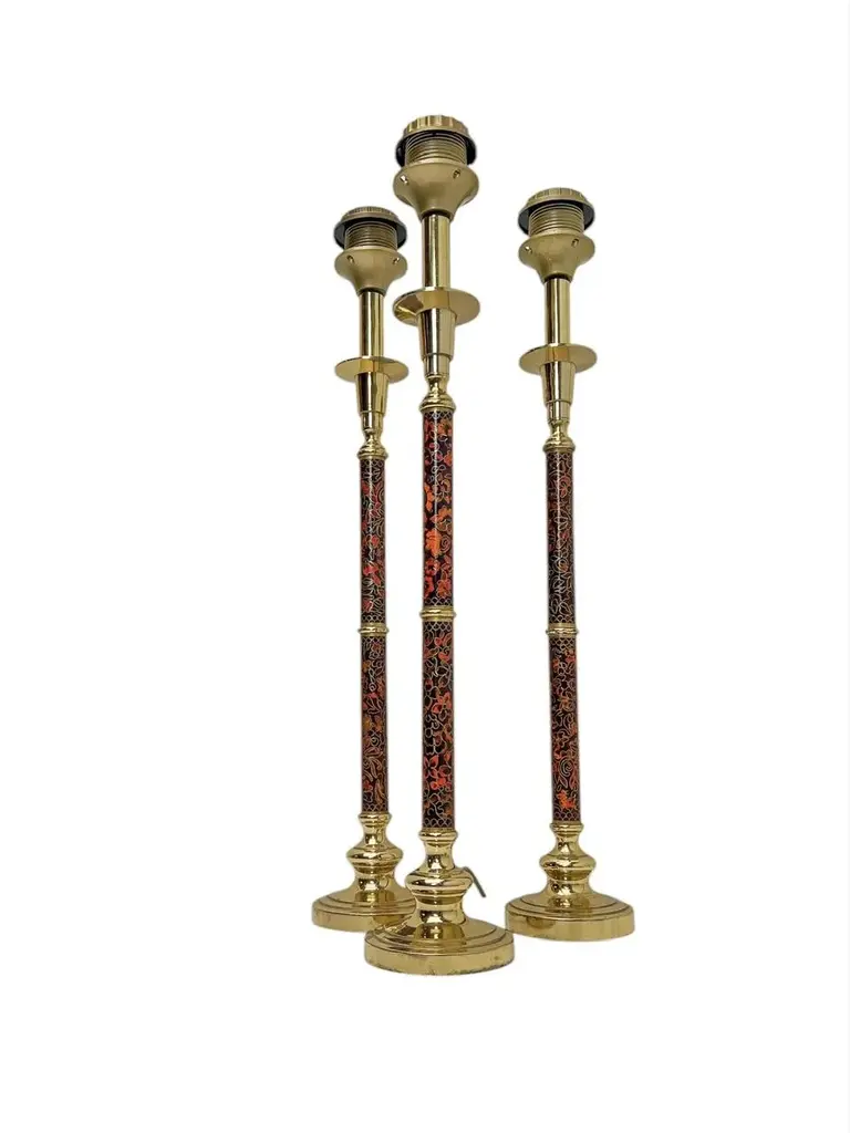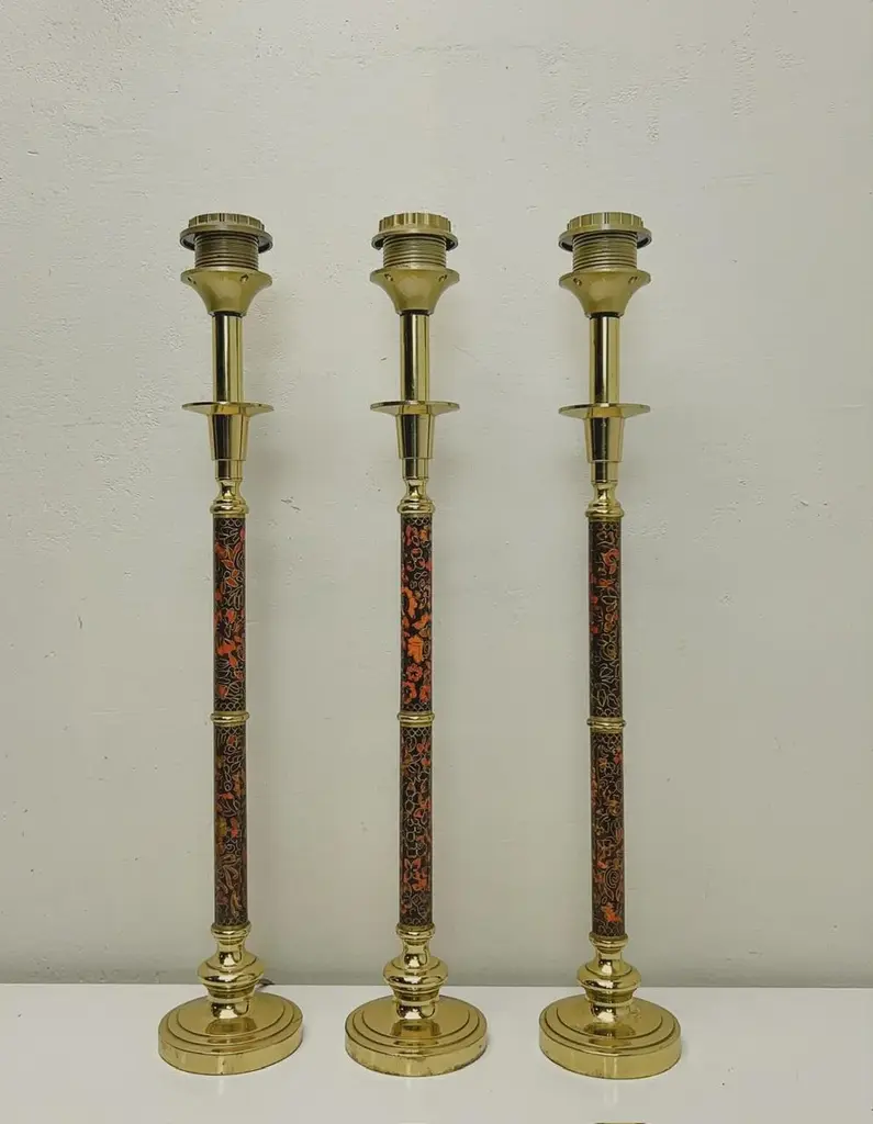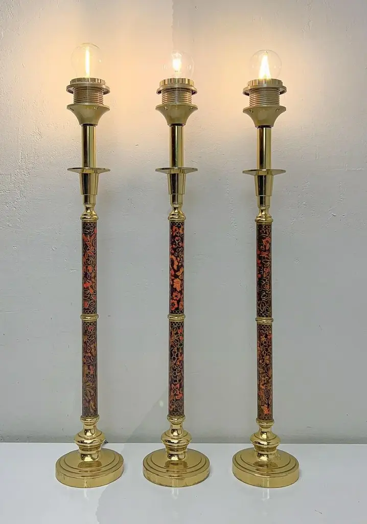 (one of) Three beautiful table lamps slim model from the 1970s. Wonderful combination of brass with fine cloisonne (I suspect Chinese-cloisonne), very decorative and special. All in very good condition. European Plug (up to 250V).The wiring of this item may be original and might need replacement, if not specified otherwise.