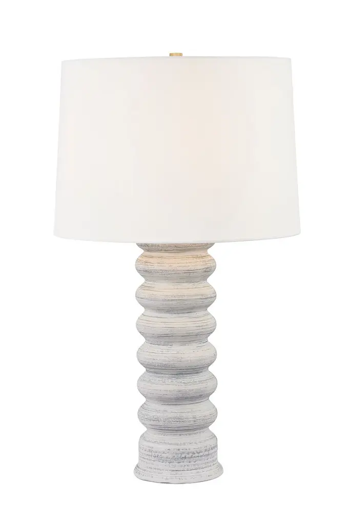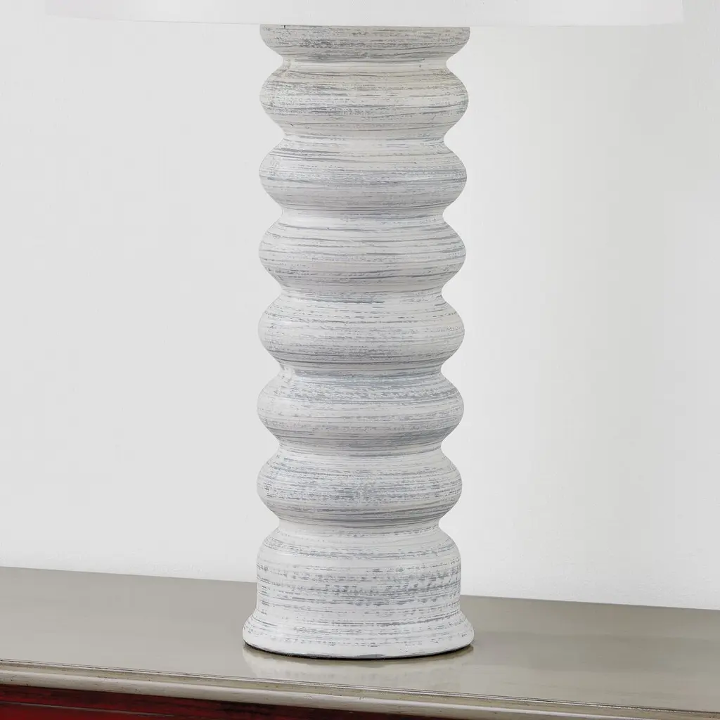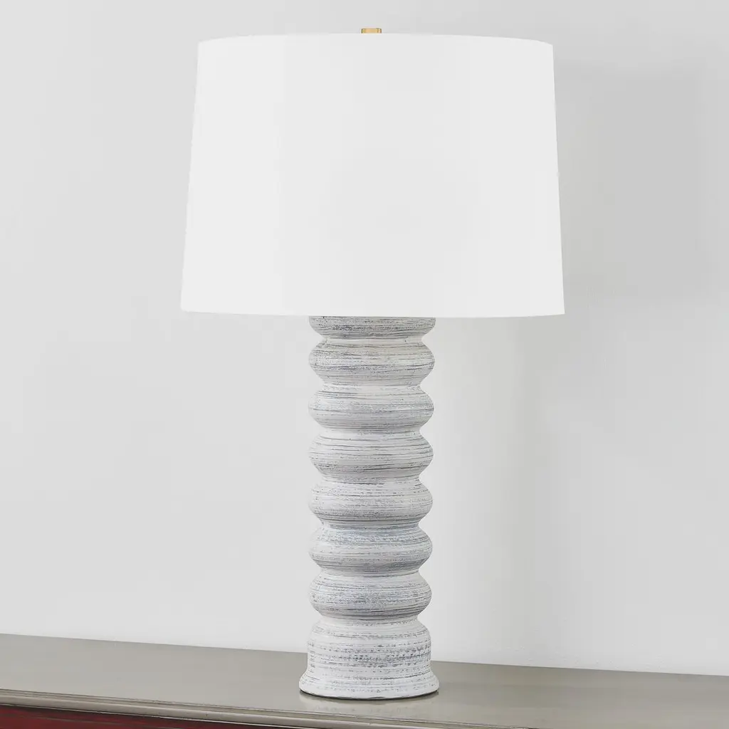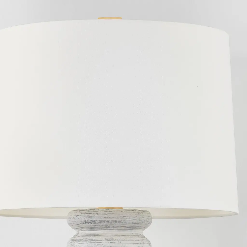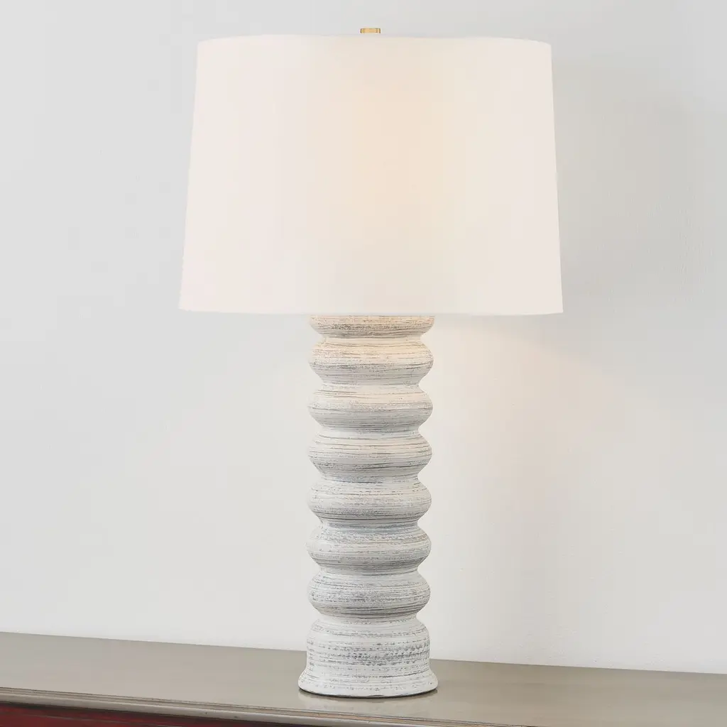 Mimicking a wheel-thrown form, the undulating ceramic base of Clove resembles a contemporary sculpture. The matte white glaze of the base is flecked with grey highlights, further accentuating the feel of a hand-painted art object. A large white linen drum shade contributes to the commanding presence of this characterful lamp.