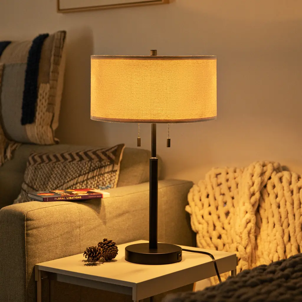 Our set of modern table lamps is a beautiful and helpful addition to any home, office, or dorm room thanks to its classic design and convenient charging station. Standing 24 inches tall, these aesthetic lights will brighten your space and your life whether needed for office desks, hallway side tables, bedroom night stands, or living room end tables. Softened by their natural linen lamp shades, our desk lamps have a retro modern look that imparts a timeless elegance to home decors from rustic farmhouse to industrial minimalist. Enjoy this pair of helpful lamps around your own home or use them as a friendship lamp set for housewarming, birthday, and Christmas presents for friends and family!Features:Specifications: