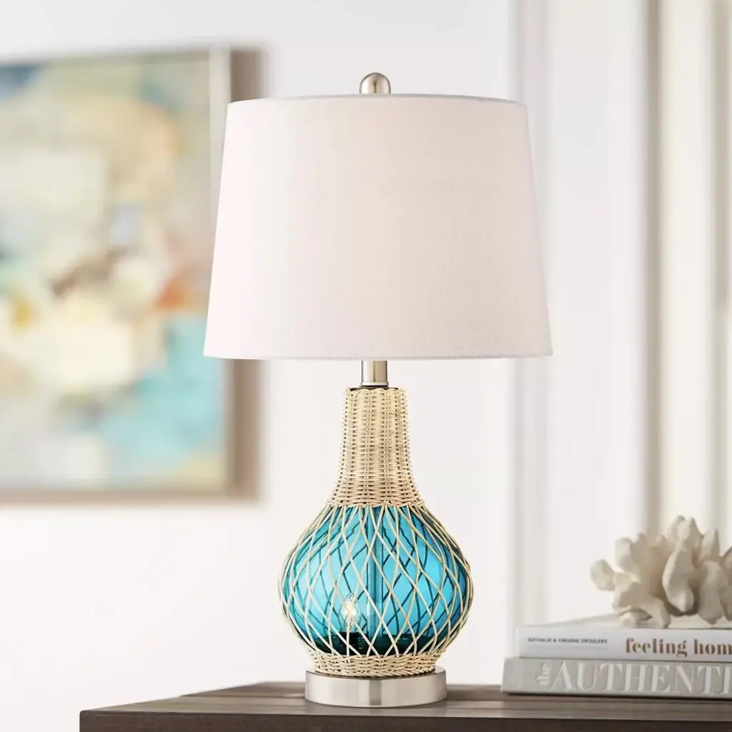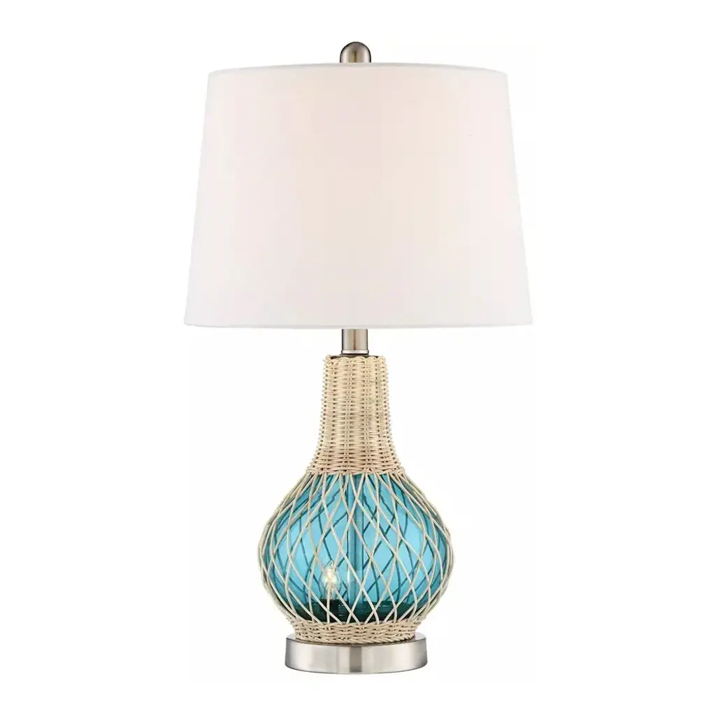 PRODUCT DETAILS: 22 3/4" high overall. Bottom base is 5" wide. Shade is 11" wide at the top x 13" wide at the bottom x 9" on the slant. Weighs 3 lbs. Uses one max. 60 watt standard base bulb for top light (not included). Includes one 2 watt LED E12 candelabra bulb for night light. 4-way socket switch: main on, night light on, both on, both off. Alana glass accent table lamp with night light. Ideal for modern coastal or nautical style rooms. Blue glass base. Rope basket accent. Silver finish metal accents. White fabric tapered drum shade. 8-foot long clear cord.