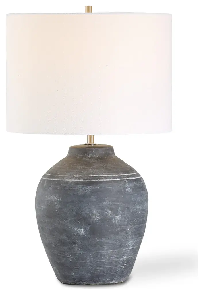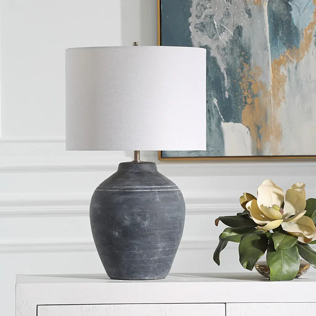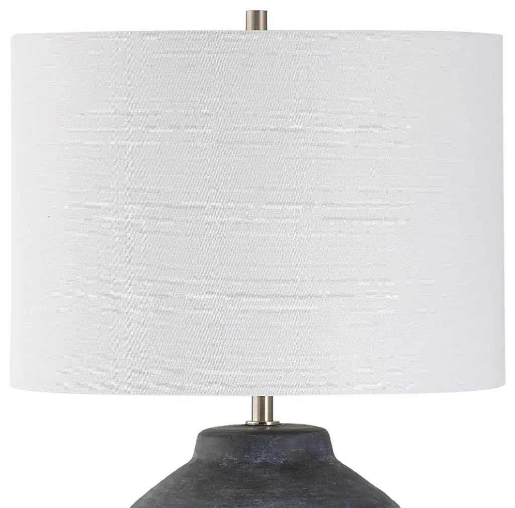 The beautiful weathered black finish, enhanced by the ceramic''s subtle texture, creates an old-world feel. Brushed nickel accents complement the finish. The round hardback shade is an off white linen fabric.