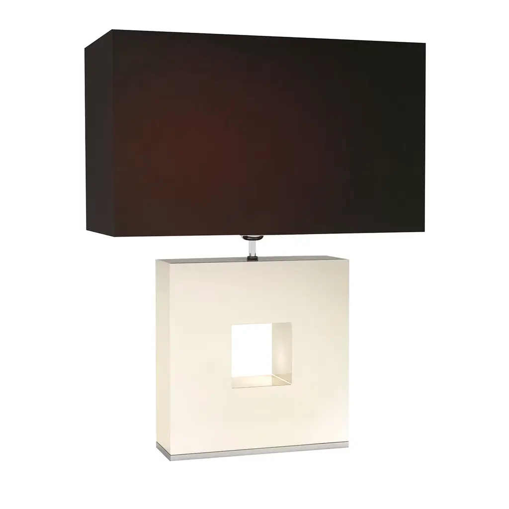 This refined table lamp is best displayed together with its white-lacquered sister on the sides of an extra-long sideboard for a mix-and-match look. Topped by a white fabric lampshade, its ethereal look is immediately counterbalanced by the square base in brown-lacquered wood with a tiny square hole to achieve an aesthetic that winks at contemporary art.