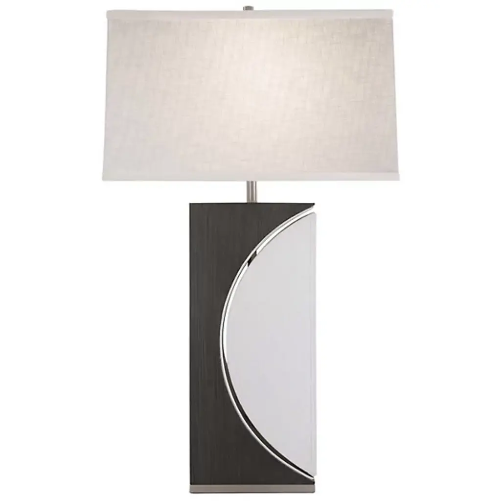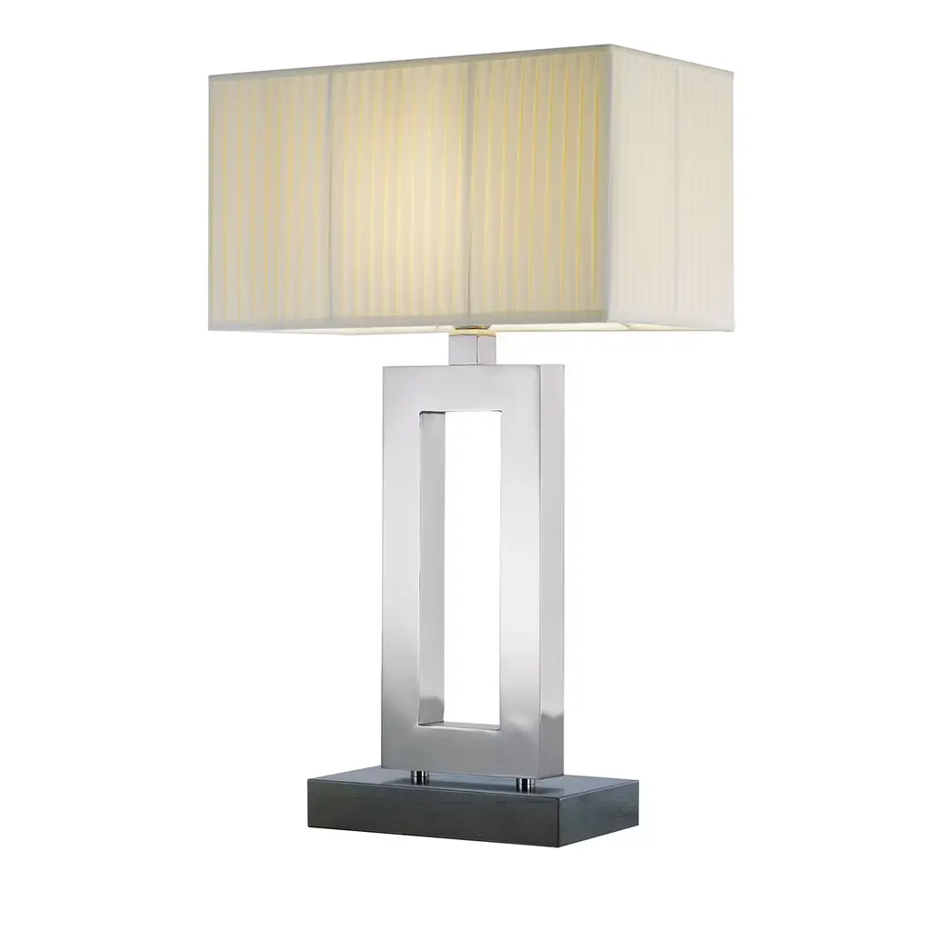 Equally stunning in neutral-toned living areas sharing its geometric inspiration or in commercial settings, this exclusive table lamp reflects Lumis's commitment to excellent lighting quality. Resting on a plinth, rectangular base in chrome-finished metal, the structural unit consists of a crispy wooden frame whose grain is enhanced by the light housed in the ivory fabric lampshade above.