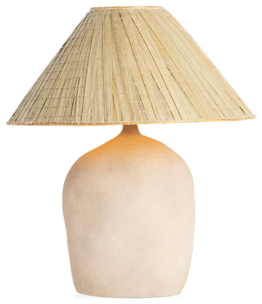 Finished in a neutral sand, a shapely talavera table lamp is topped with a natural palm shade, for a light, textural look.