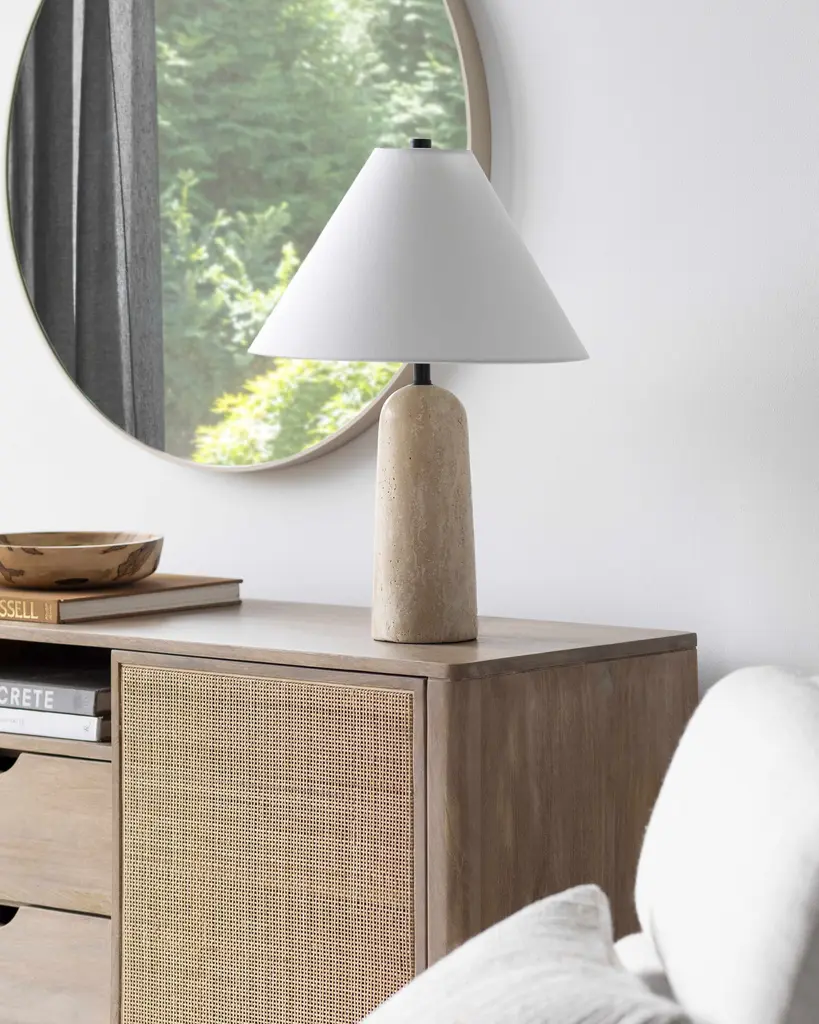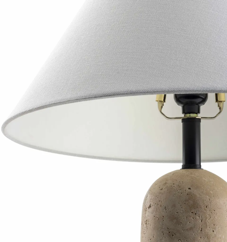 Collection: Cocachacra Colors: White, Light Beige Material: Body: Travertine,Shade (Outside): Linen,Shade (Inside): Polystyrene,Finial: Iron Styles: Contemporary Made In: China Shade Material: LinenPolystyrene Shade Color: WhiteWhite Cord Length: 6' Switch Type: On/Off Number of Bulbs: 1 Socket Type: E-26 Bulb Wattage: 60W