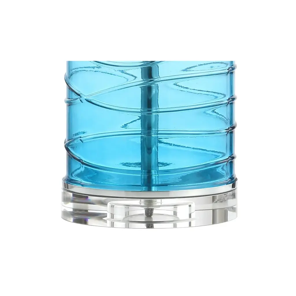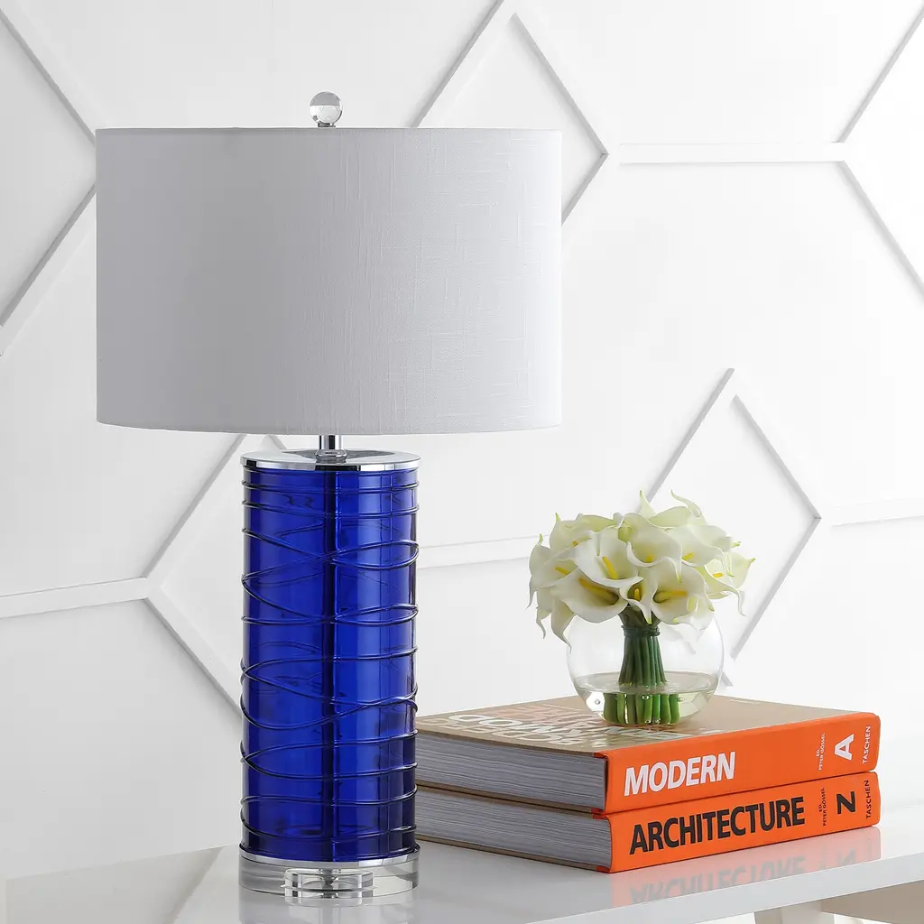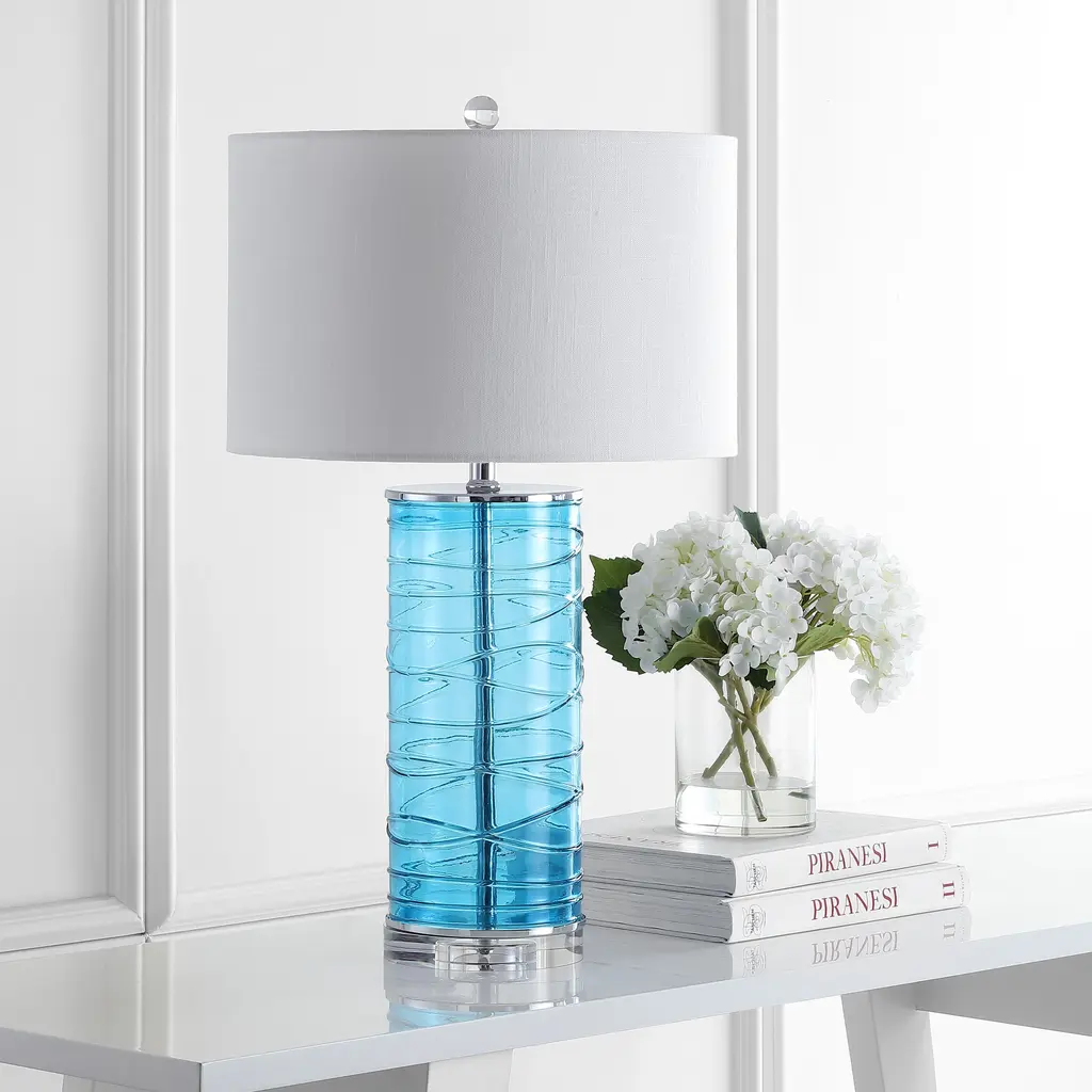 A pair of lamps to add sparkle to your space. Ribbons of glass create unique patterns on this lamp's glass cylinder base. The clean, simple lines and a drum shade have mid-century modern flair, while the deep Moroccan turquoise color adds a touch of glam.Features:Dimensions:About us:You see a lamp.We see a decorative work of art.A perfectly curved shade casts a dramatic shadow on a floor. A silk cord you never want to hide. Compatible with LED lightbulbs: as easy on the environment as they are on the eyes. The JONATHAN Y Lighting collection considers every detail from impeccably sourced materials to designer styling. And our prices are so attractive, we've transformed a functional necessity into a fashion accessory.JONATHAN Y Lighting - a fashion revolution in home decor.