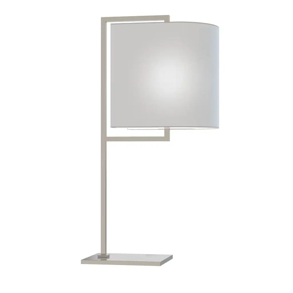 A distinctive design marked by a rigorous geometry, this gorgeous table lamp will be a timeless addition to a contemporary interior space. Made of polished nickel-finished metal, the angular frame extends from a base enriched with grinded mirrored glass and it is completed with a white cotton shade for a well-diffused and elegant glow. Please refer to the Concierge for more details and customization options.
