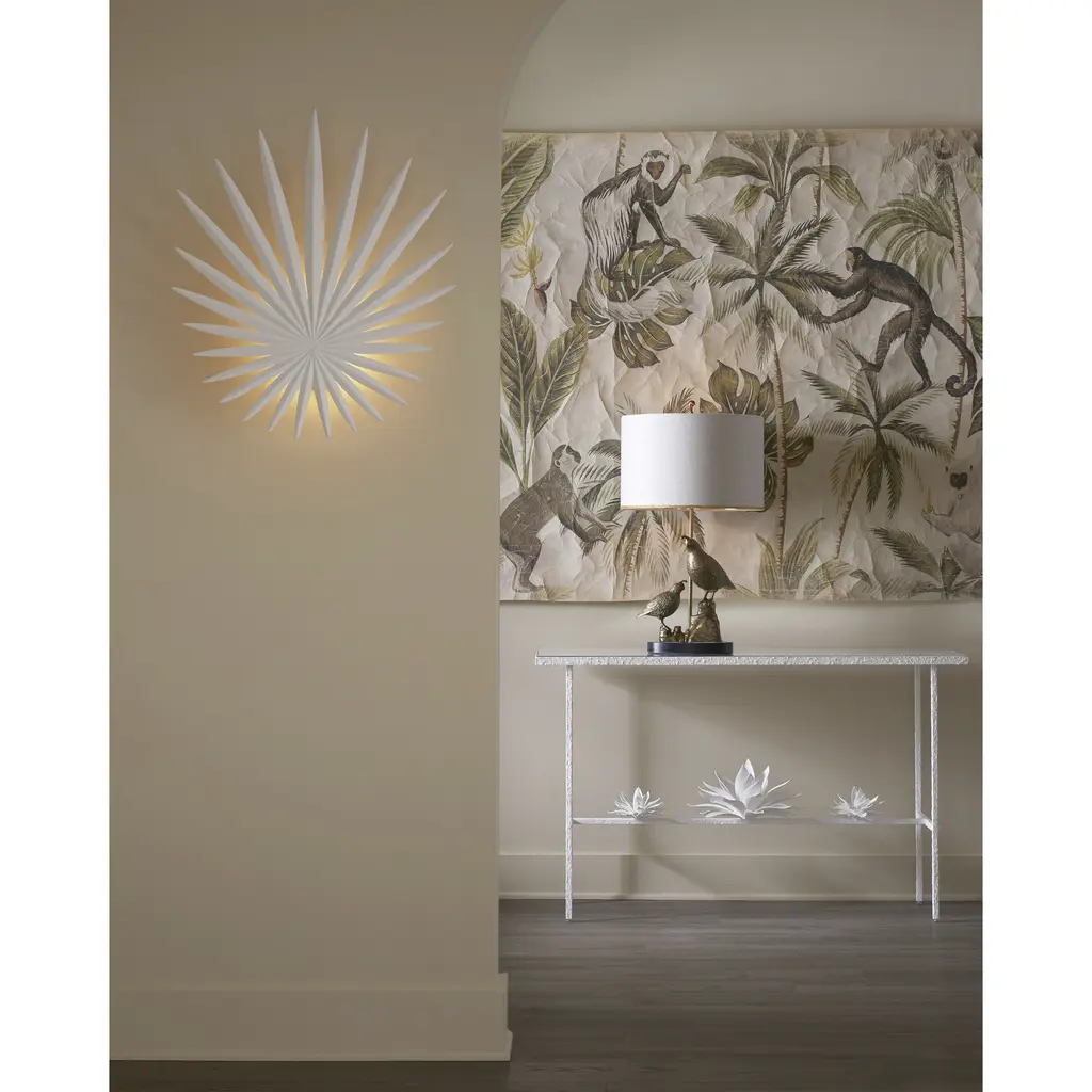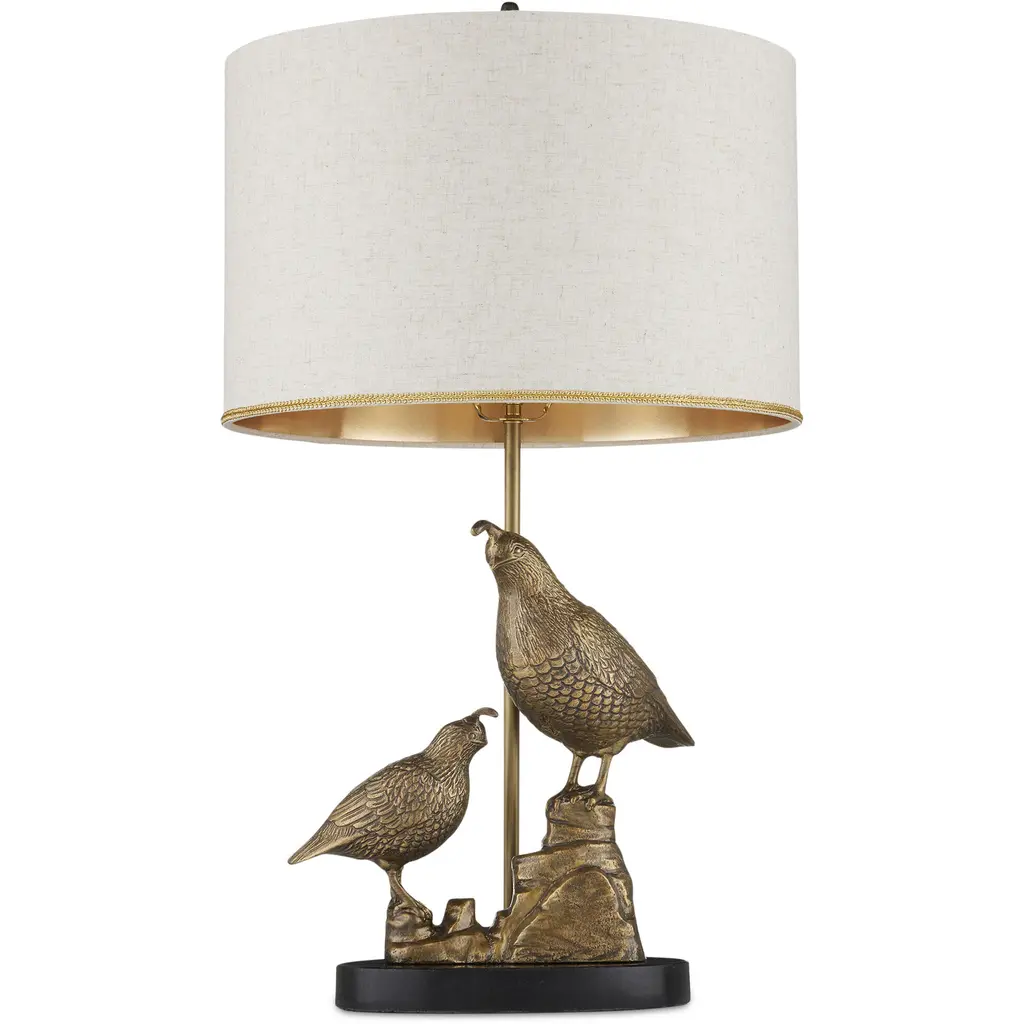 When Marjorie Skouras designed the Codorniz Brass Table Lamp, she was inspired by the Mexican quail that roam the meadows and woods of the Yucatan Peninsula that she calls home. The pair of quail and the rocky ledge on which they are perched are fashioned from cast aluminum in an antique brass finish. The black marble base is honed rather than polished and the natural linen shade with gold foil lining has glimmering gold trim on its top and bottom edges. A whimsical design detail is the finial that is shaped like a quail's head-feather.