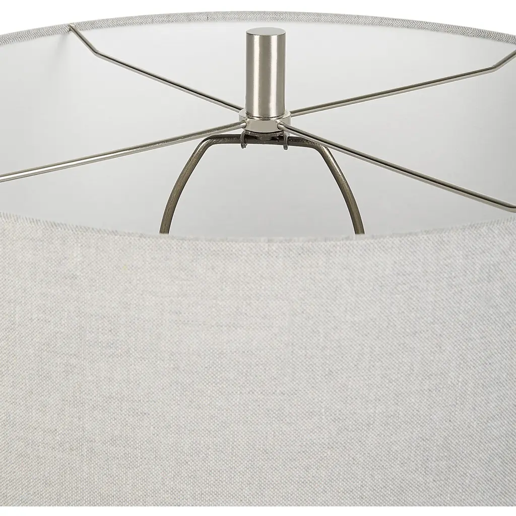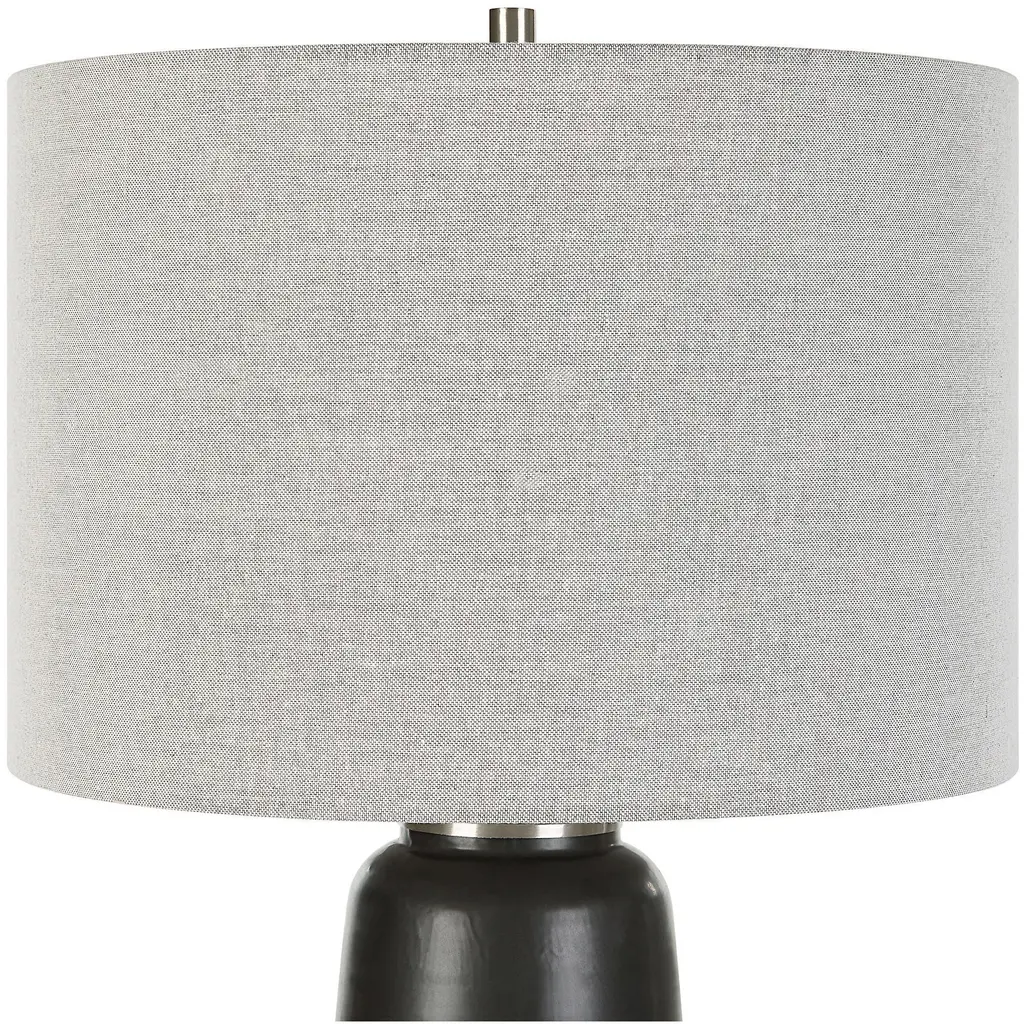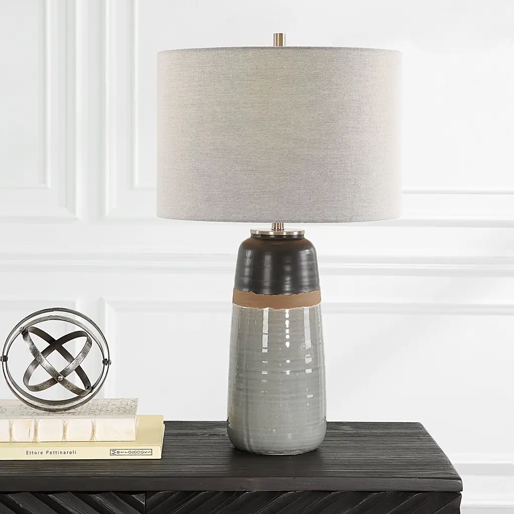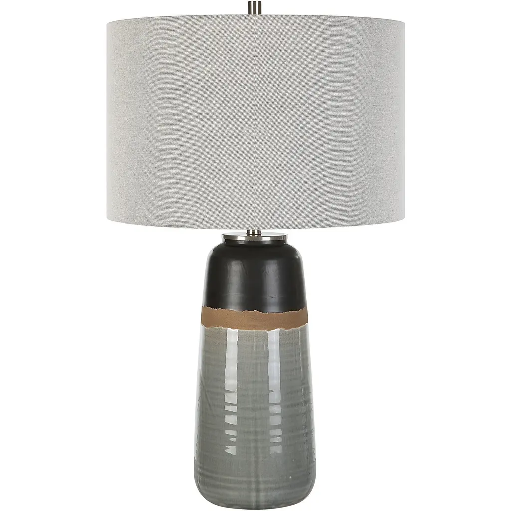 This Ceramic Table Lamp Features A Warm Gray And Aged Black Glaze Finish Separated By A Rustic Brown Uneven Band, Accented With Brushed Nickel Details. The Round Drum Shade Is Made With A Casual Light Gray Linen Fabric. Due To The Nature Of Fired Glazes On Ceramic Lamps, Finishes Will Vary Slightly.