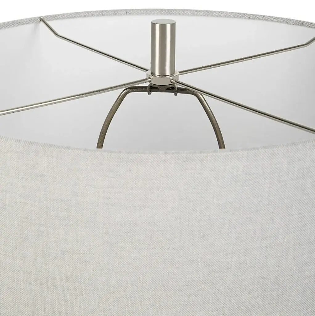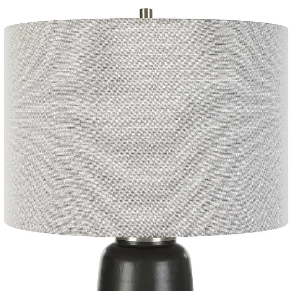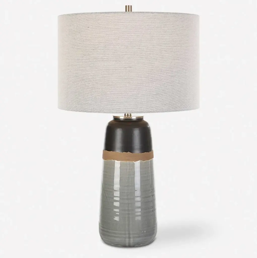 The Coen table lamp highlights a contemporary aesthetic with its natural tones and contrasting finishes. A warm gray and aged black glaze is accented by a rustic uneven brown band and brushed nickel details. The round drum shade, wrapped in light gray linen fabric, adds a touch of modern elegance. Due to the nature of fired glazes on ceramic lamps, finishes will vary slightly.