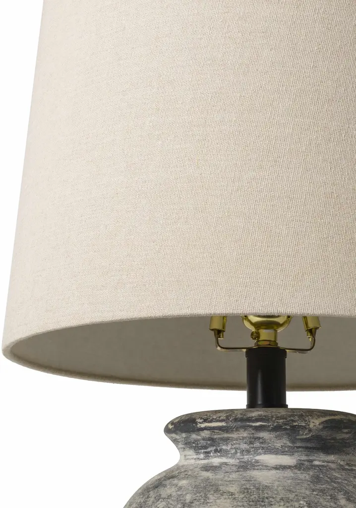 Collection: Cofrentes Colors: Gray, Beige, White, Black, Metallic - Brass, Translucent Material: Body: Ceramic,Shade (Outside): Linen,Shade (Inside): Polyester,Finial: Iron Styles: Traditional Made In: China Lighting Type: Accent Table Lighting Shade Material: LinenPolyester Shade Color: WhiteBeige Cord Length: 6' Switch Type: 3-Way Number of Bulbs: 1 Socket Type: E-26 Bulb Wattage: 100W