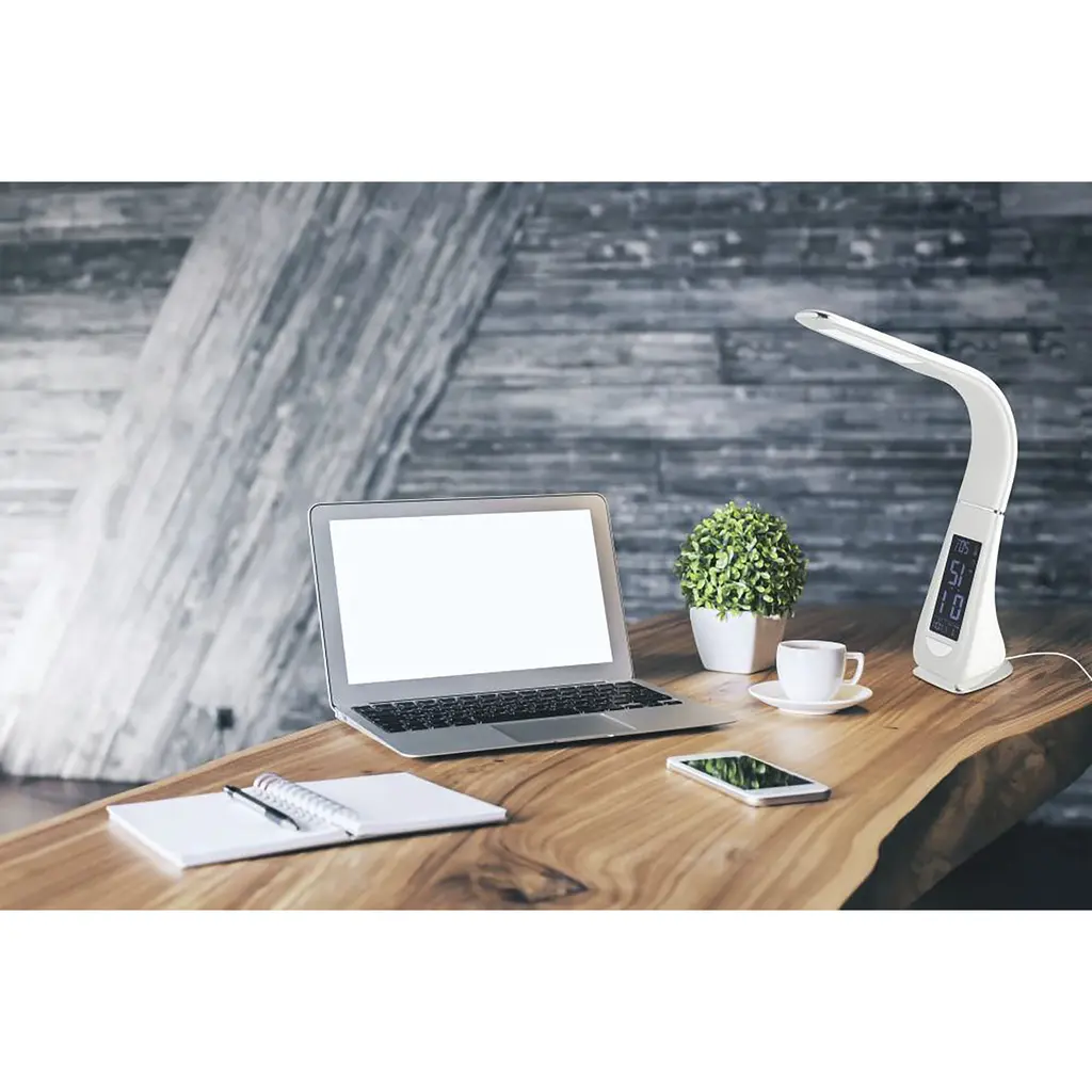 The Cognoli LED desk lamp is small yet mighty. The body of the lamp has a sophisticated leather look and chrome details. This lamp can be dimmed with the integrated 3-step touch switch and the flexible gooseneck allows for targeted illumination of your workspace. Boasting a convenient LCD clock, with temperature and date display, this lamp also impresses with an alarm clock function with different choice of sounds. With a modern design and stylish details, this lamp with is a practical and decorative must-have for your home office or bedside table.